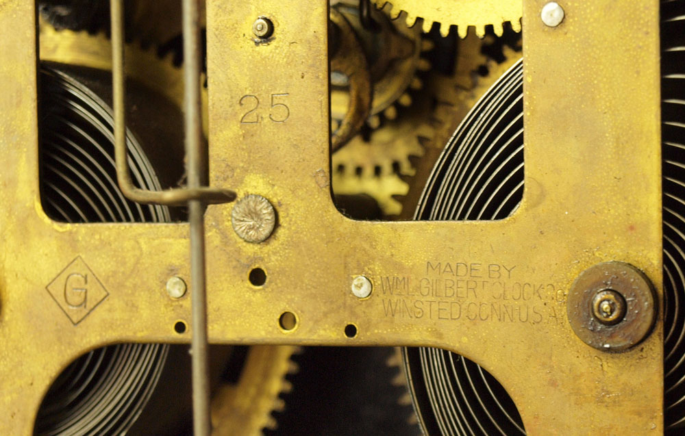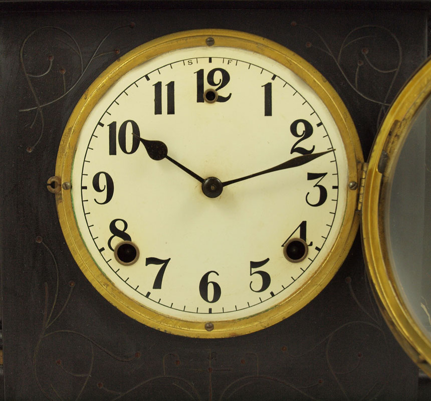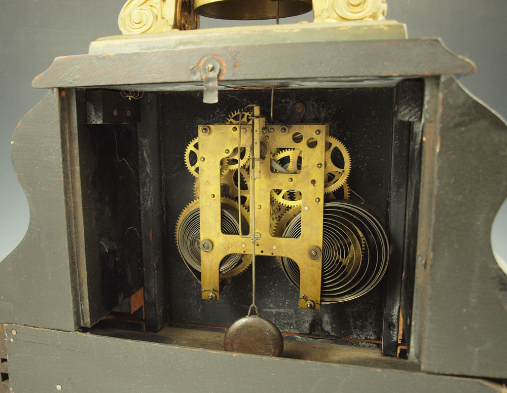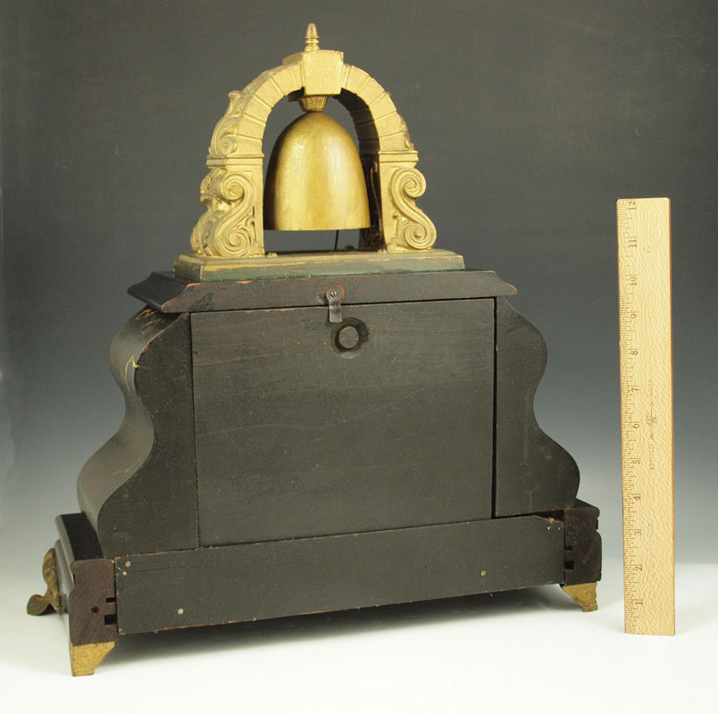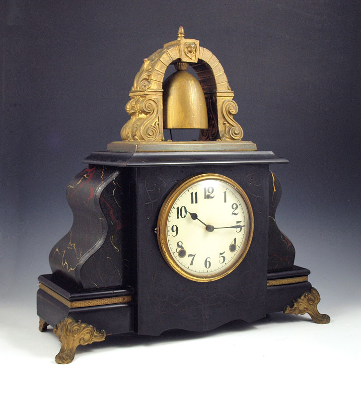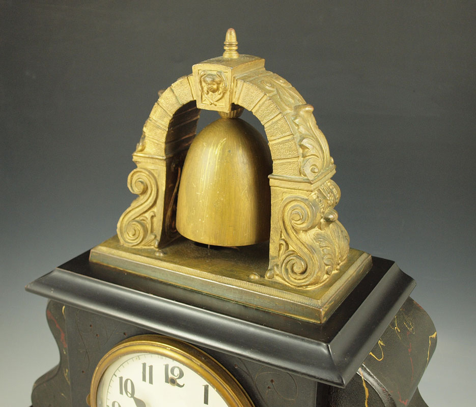 WILLIAM GILBERT CURFEW MANTLE CLOCK: Second of 3 of these clocks. Faux marble wood case with patinated cast metal mounts and bell. Alligator finish. Paper over metal face with Arabic numeral, marked William L. Gilbert Clock Co. Time & strike Gilbert movement. 17'' h. x 17 1/4'' x 6''. Key and pendulum in office.