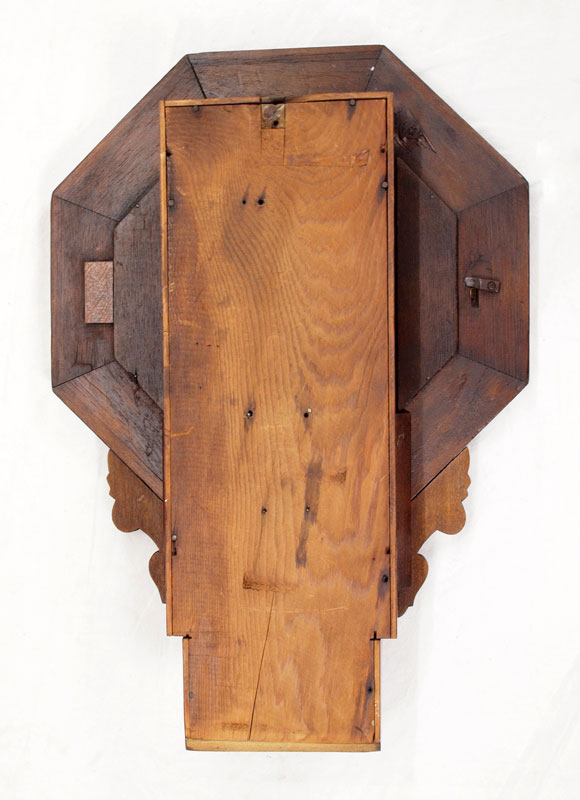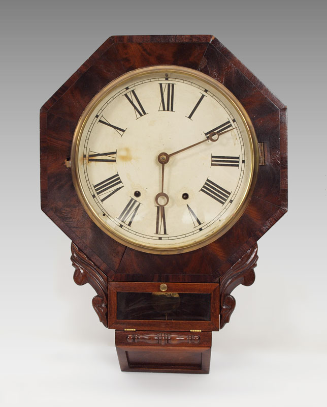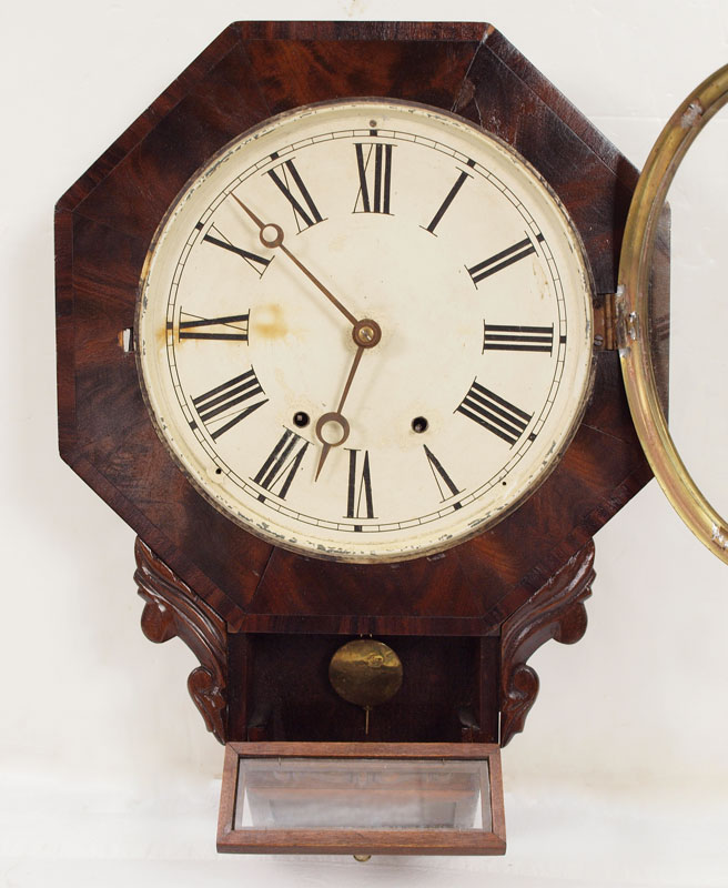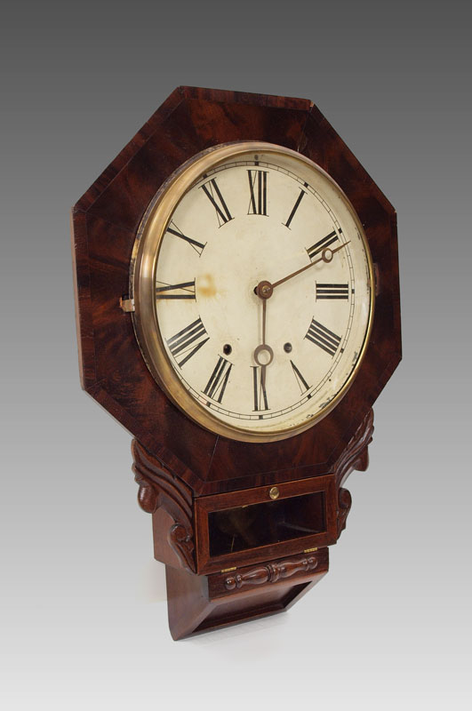 ENGLISH CASE CARVED OCTAGONAL WALL CLOCK: Octagonal case with applied carved accents. Painted metal face with Roman numerals, American time & strike movement. 24'' h. x 17'' x 4 1/2''.