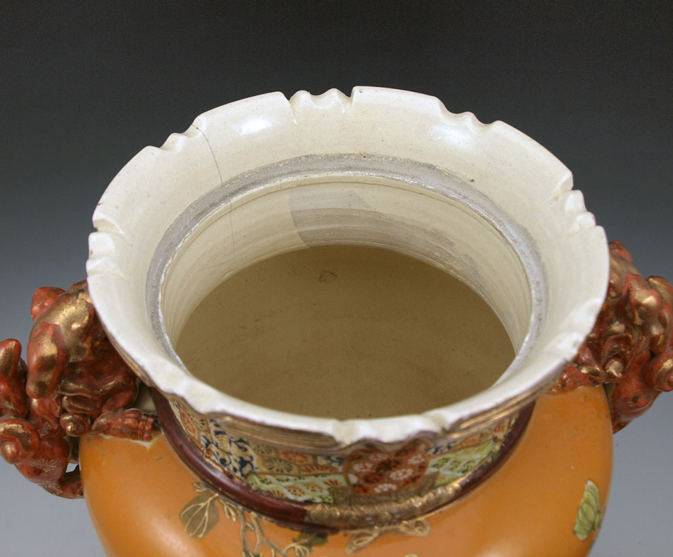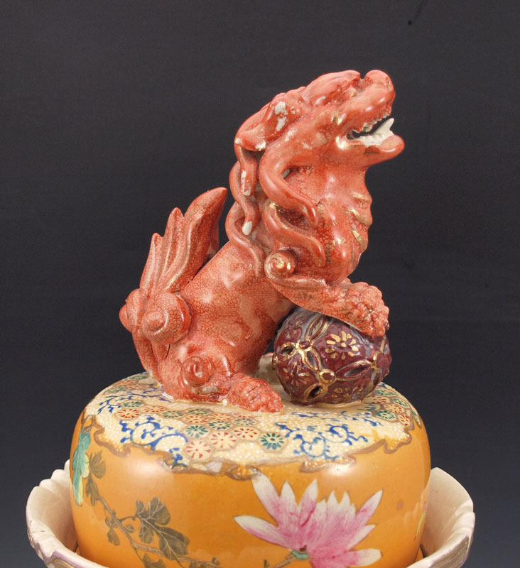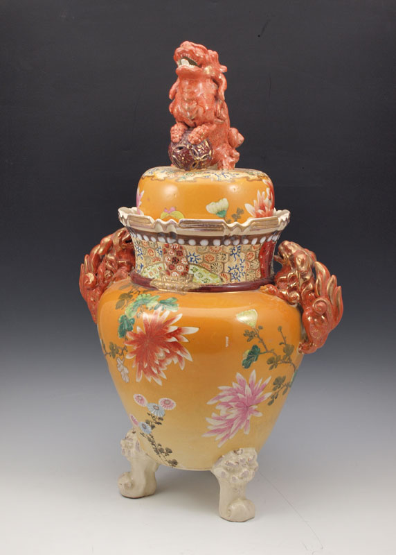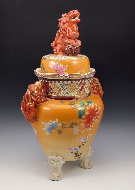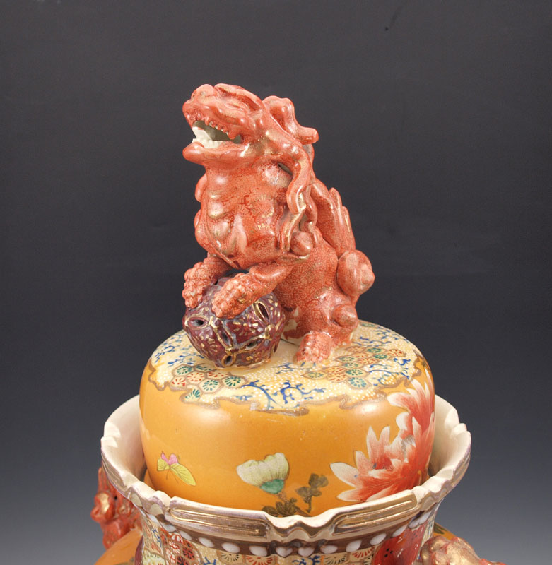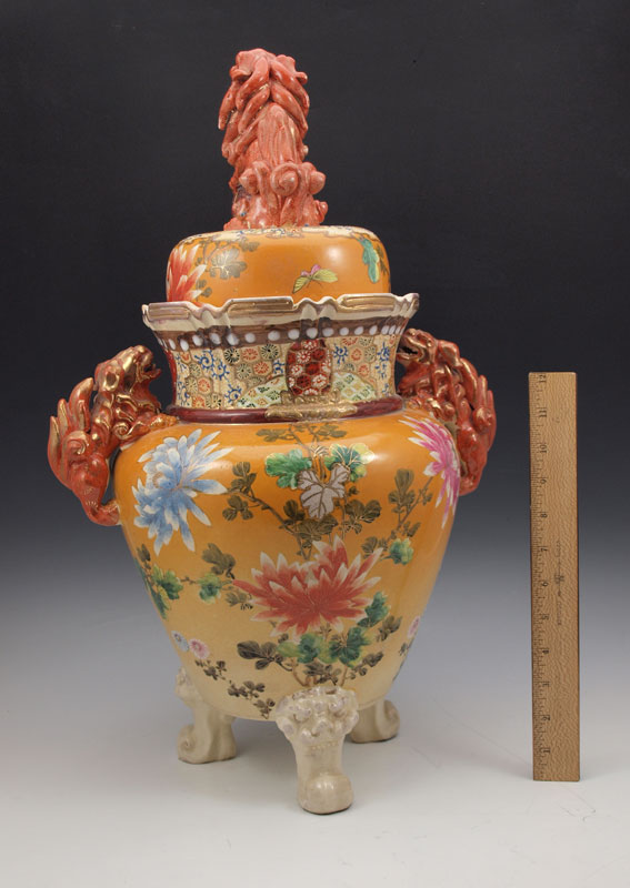 JAPANESE EARTHENWARE SATSUMA COVERED URN: Early to mid 20th C. Superb coloration with dragon handles and foo dog finial on the lid, scrolled feet. 22'' tall, 17''w.