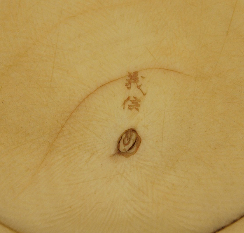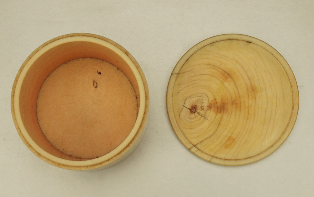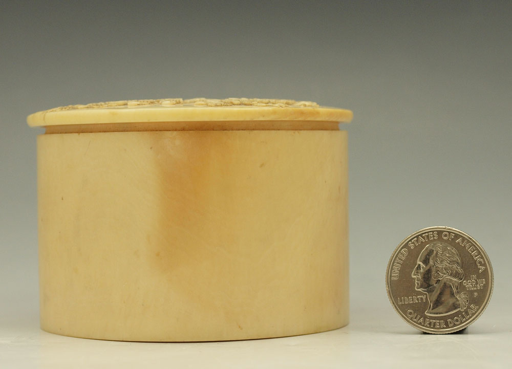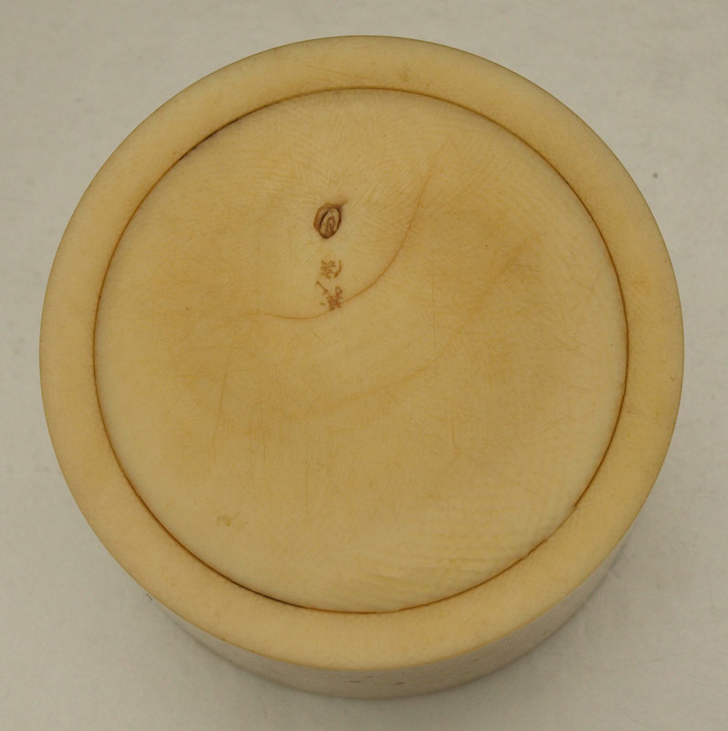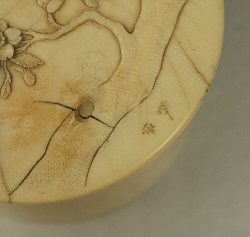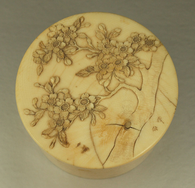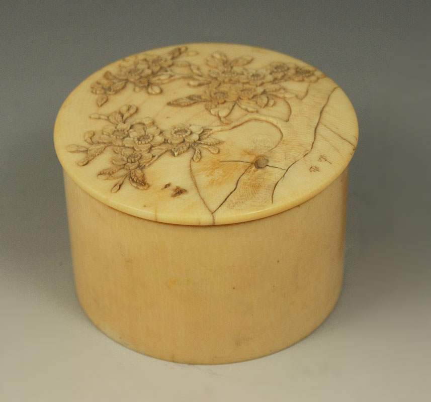 JAPANESE TRIPLE SIGNED CARVED IVORY COVERED BOX: Prunis motif carved into the lid. 2''h., 3'' dia.