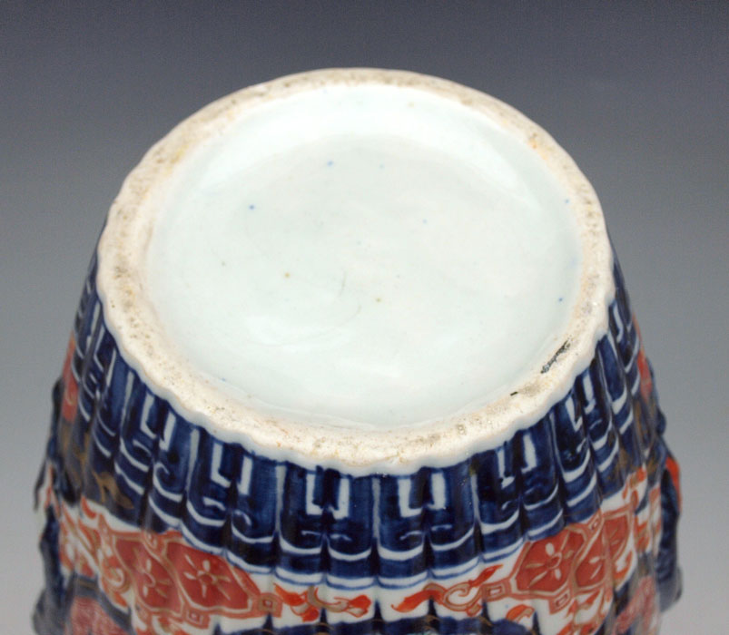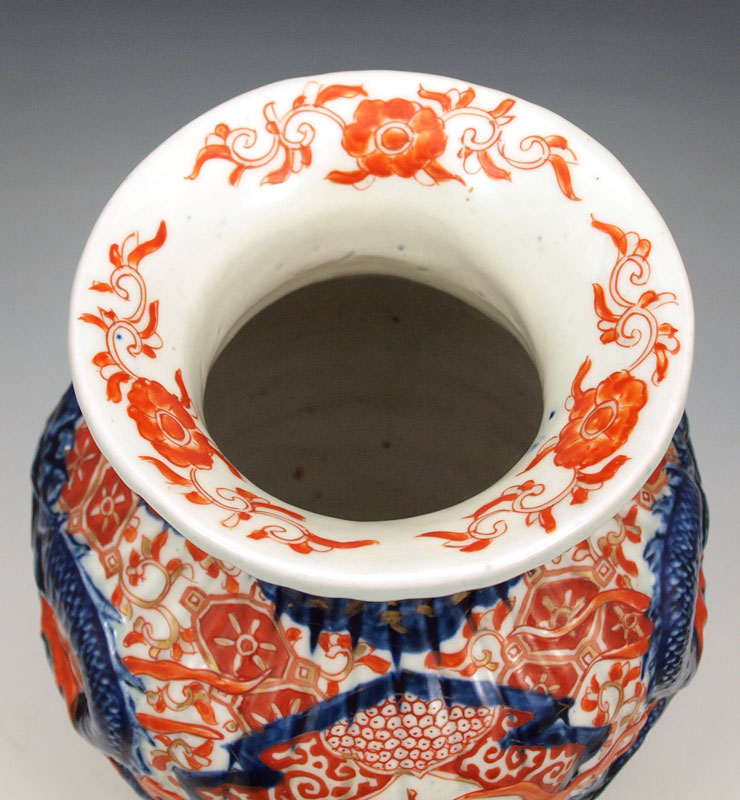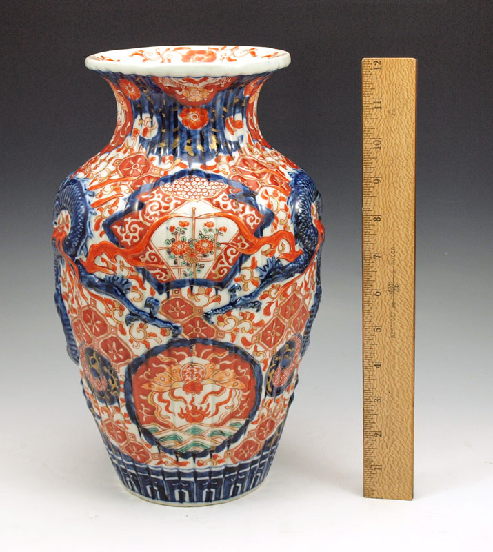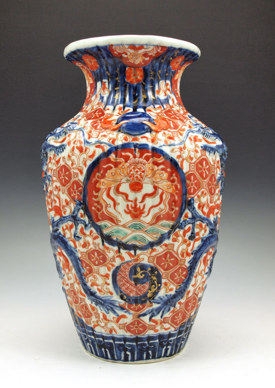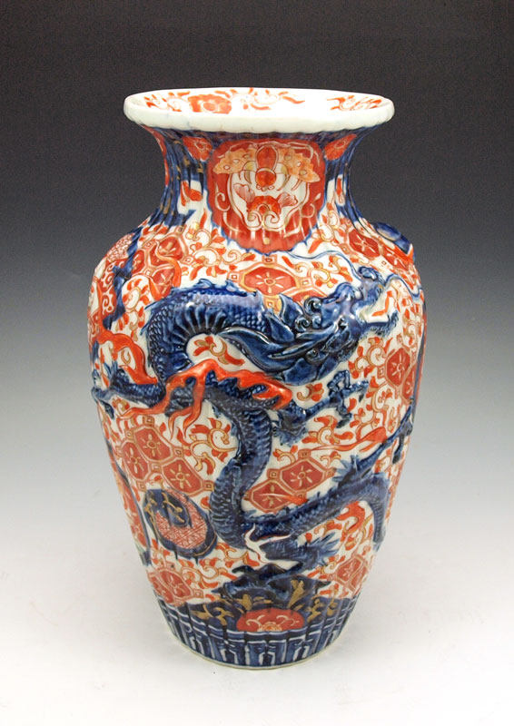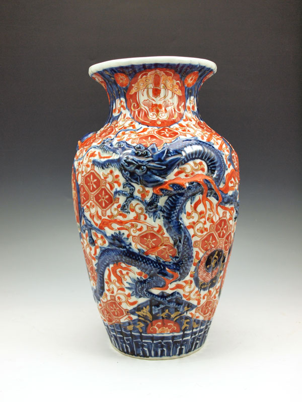 CHINESE CERAMIC VASE: Late 19th - early 20th C. vase with raised dragon design, Imari iron red and cobalt colors, 12''h. x approx. 8'' dia.