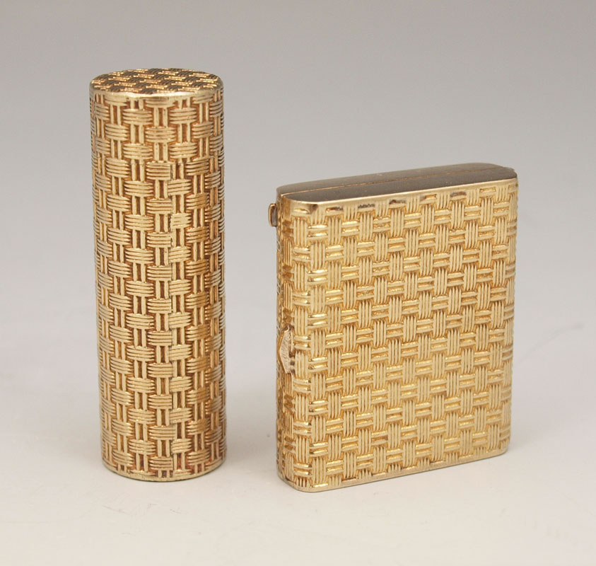 CARTIER 14K GOLD LIPSTICK & PILL BOX: 14K yellow gold in a basket weave texture. Both pieces are signed Cartier and are stamped 14K. The lipstick is 2''l., 5/8'' dia. The hinged box. 1 1/2'' x 1 3/8''. Approx. 49.2 grams.