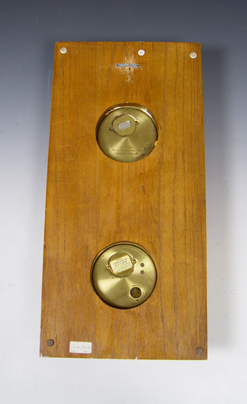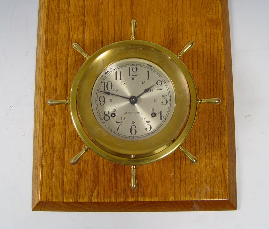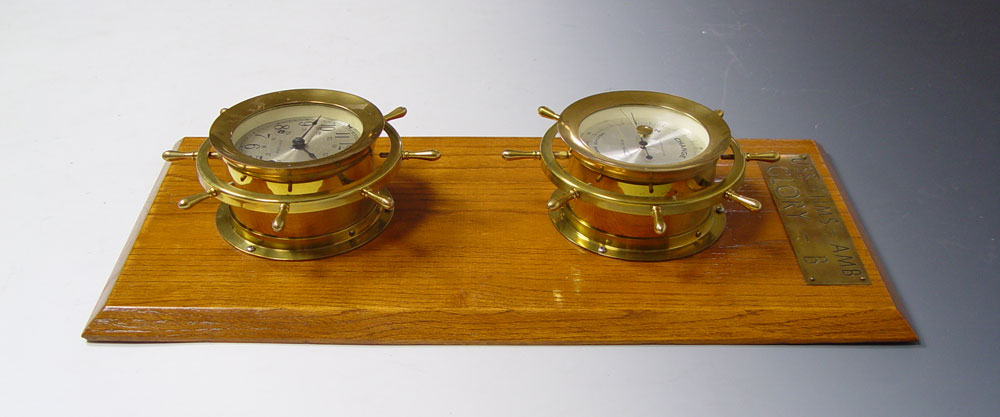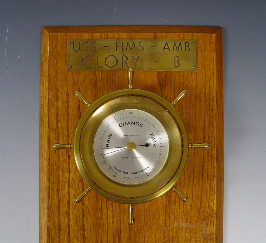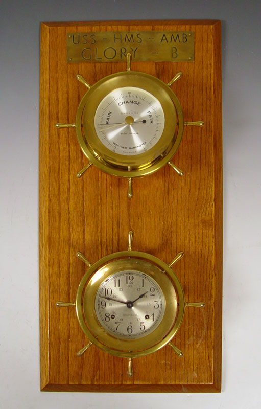 SETH THOMAS SHIPS WHEEL CLOCK & BAROMETER SET: Uniquely mounted on board with plaque. Plaque reads ''U.S.S. - H. M. S. - A. M. B. Glory - B''. Time & strike movement with silent. 24'' h. x 11 1/2'' x 4''. Replacement key in office.