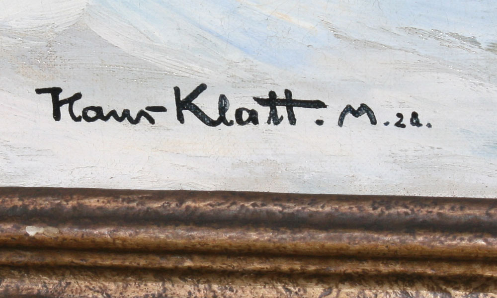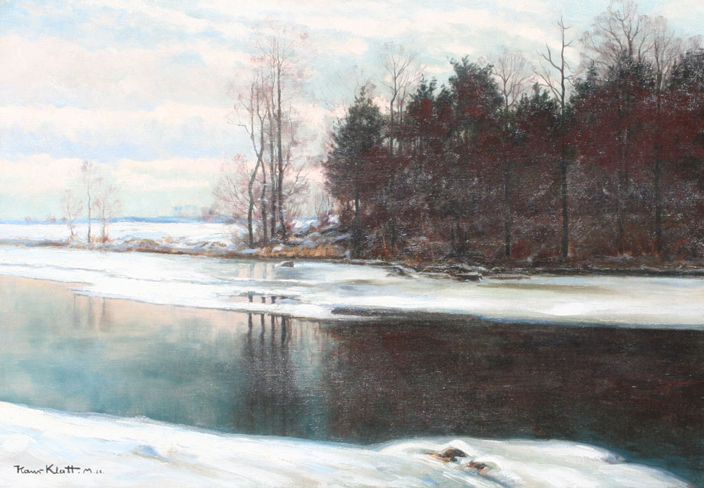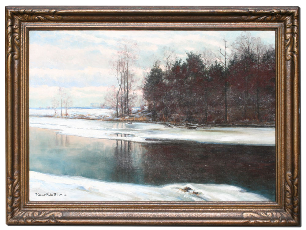 KLATT, Hans, (German, 1876-1936): ''Winter en der Ost?'' Large Snowy Winter River Landscape, OIL/Canvas, 28'' x 39 1/2'', signed and dated '24, encased in heavy period carved and gilded frame with mild wear, 35 1/2'' x 47''.