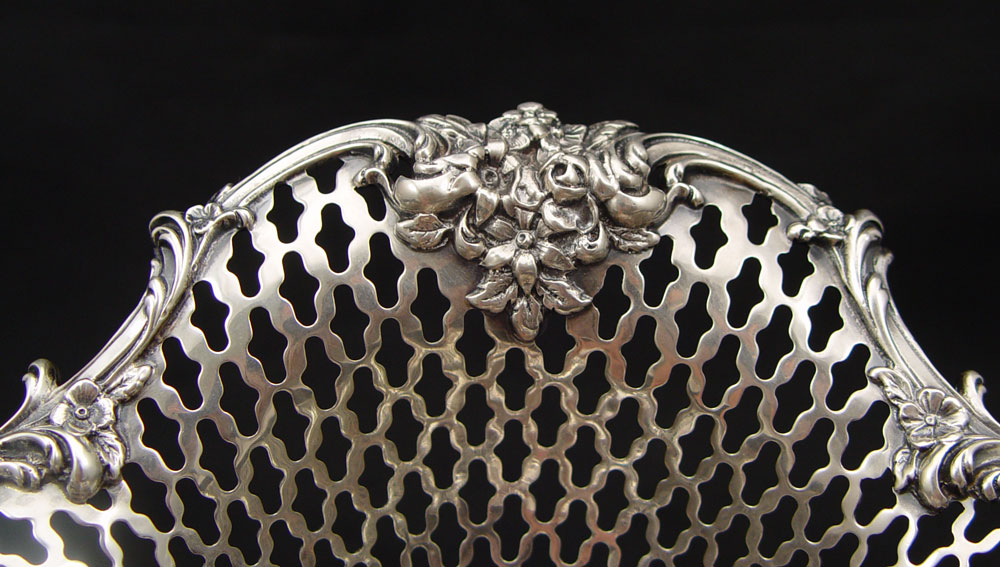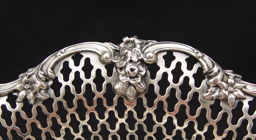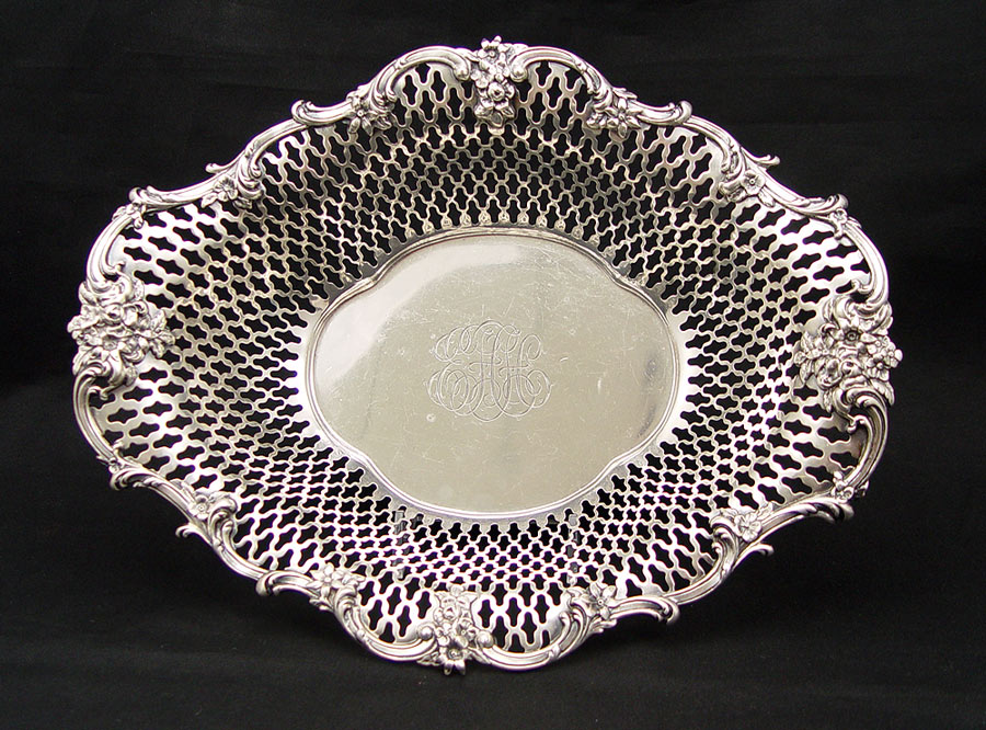 HOWARD & CO. STERLING RETICULATED BASKET: Monogrammed interior, dedication on base. Approx. 14.6 troy oz. 2 1/2'' h. x 11 1/2'' x 8 7/8''.
