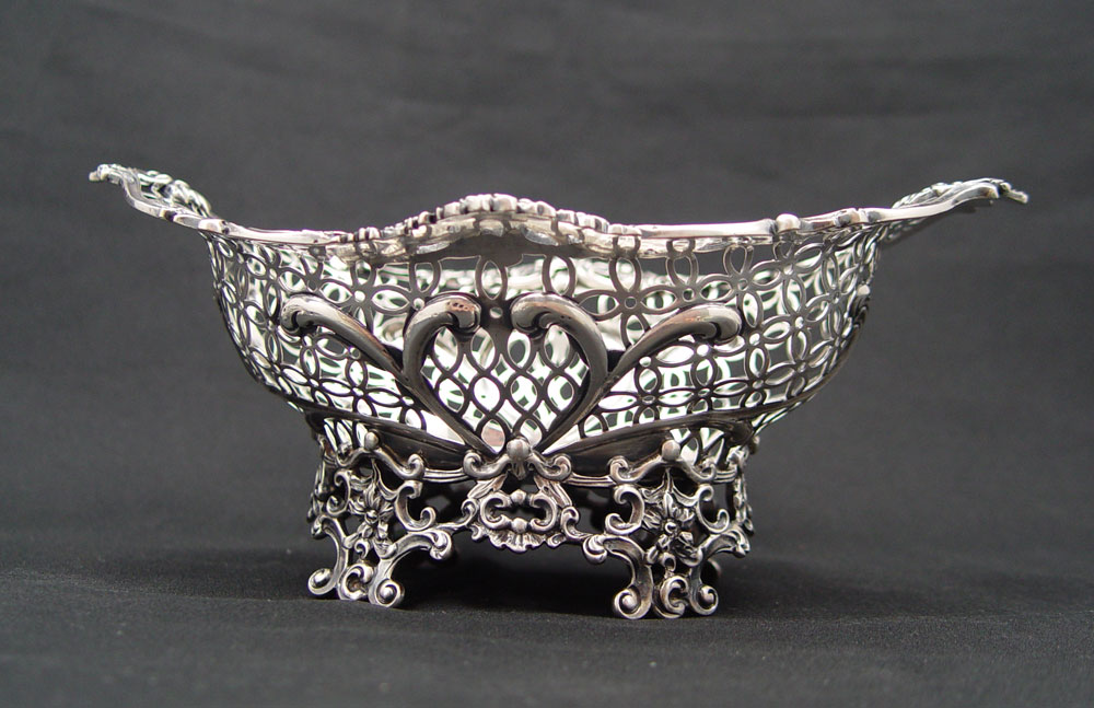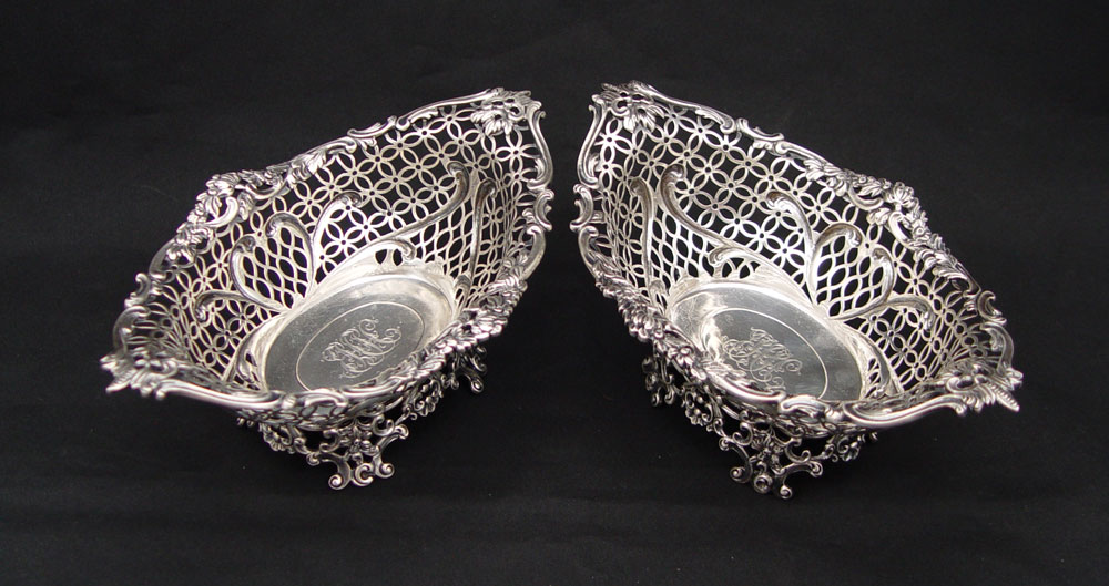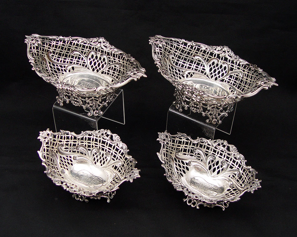 COLLECTION OF 4 ENGLISH SILVER RETICULATED BASKETS: To include 1) Pair 1888 F. B. Thomas & Co. London. Monogrammed. 3'' x 8'' x 5''. 2) 2 1890 London hallmarked with W.C. in diamond. Monogrammed. 2 1/2 h. x 6 1/4'' x 4 1/2''. Approx. 23.8 troy oz.