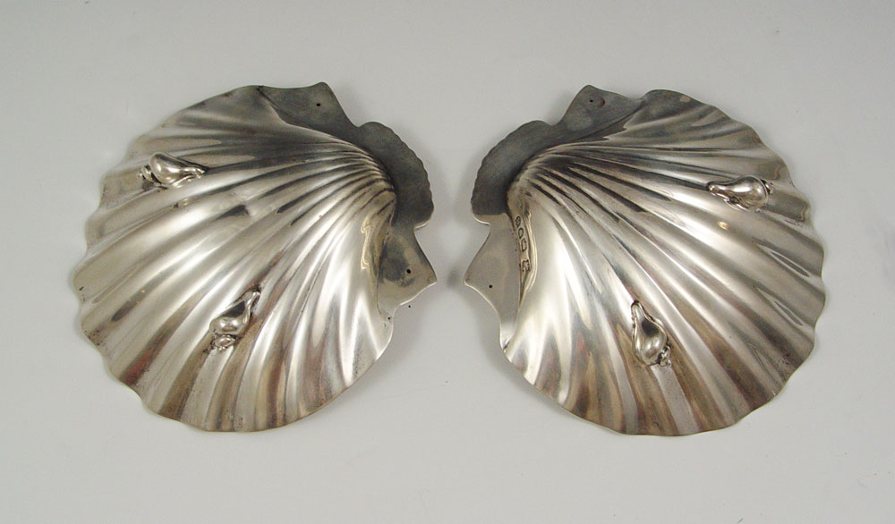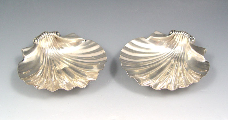 PAIR GARRARD ENGLISH SILVER SHELL FORM CANDY DISHES: 1892 James Garrard London hallmarked wit 2 shell form feet. 1 1/4'' h. x 4 7/8''. Approx. 6.9 troy oz