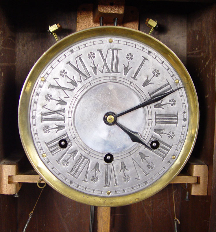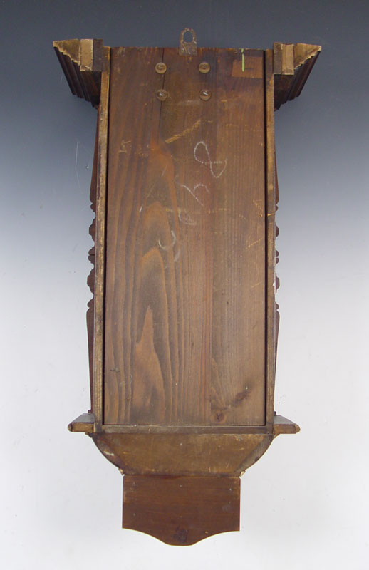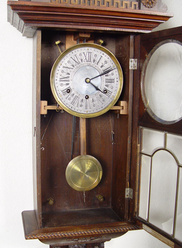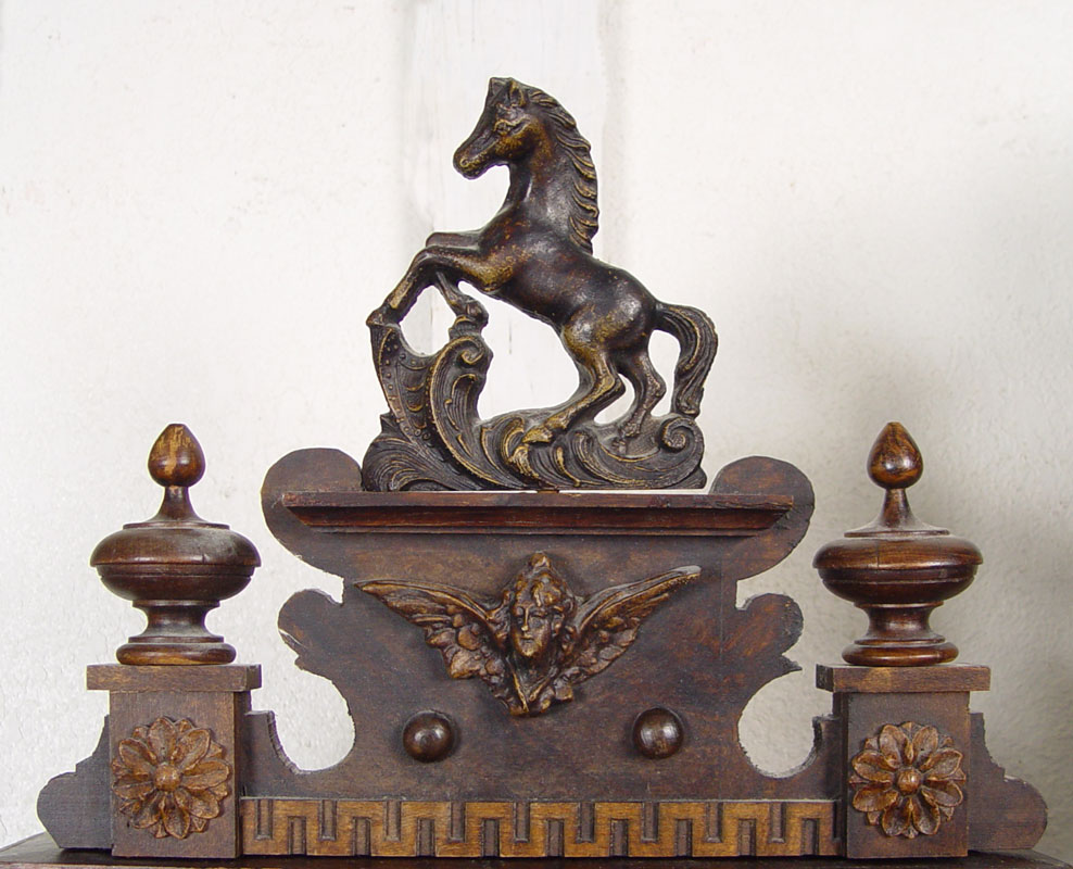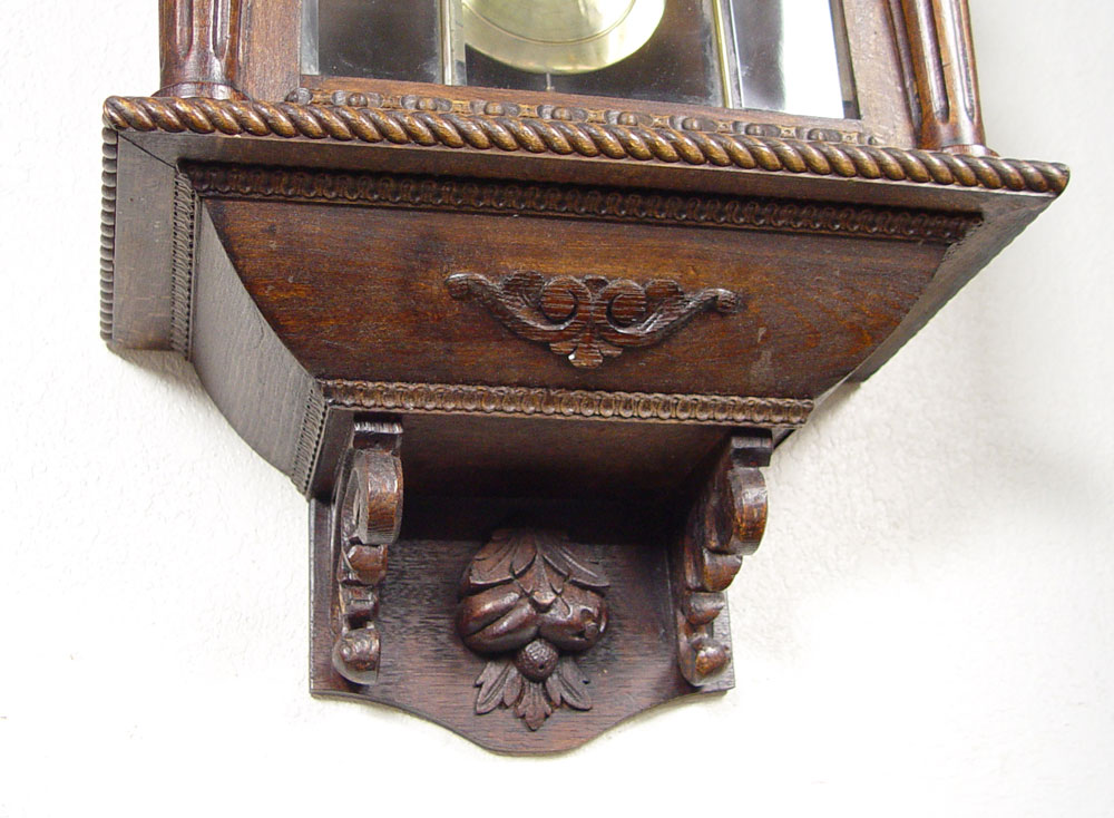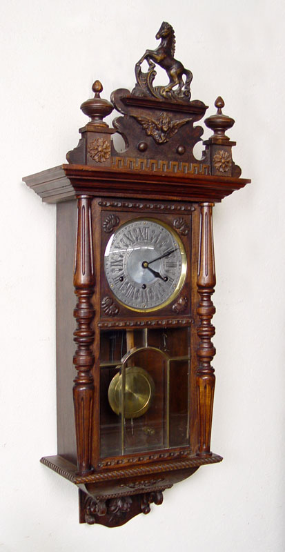 VEDETTE CARVED FRENCH WALL CLOCK WITH HORSE: Carved wood case with applied half columns, leaves and nuts. Removable pediment with carved horse, masqueron and urn finials. Mixed metal face with Roman numerals. Signed Vedette French key and pendulum movement with S.G.D.G Breveret. 43 1/2'' h. x 17'' x 9''. Key in office.