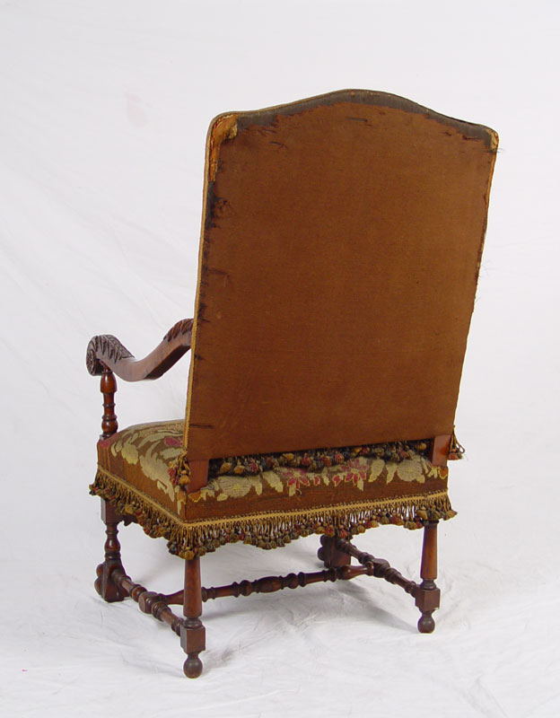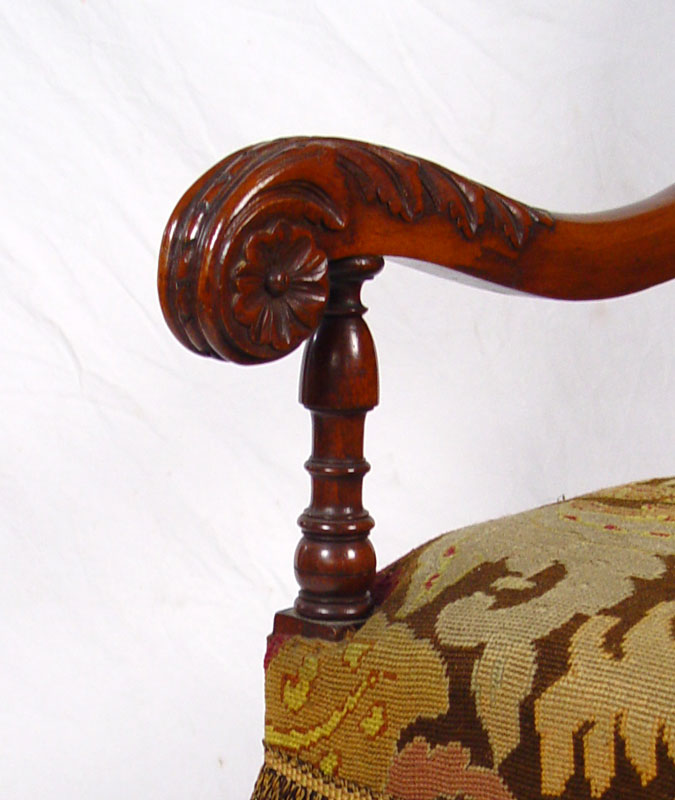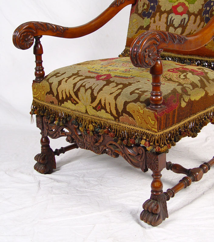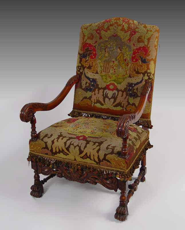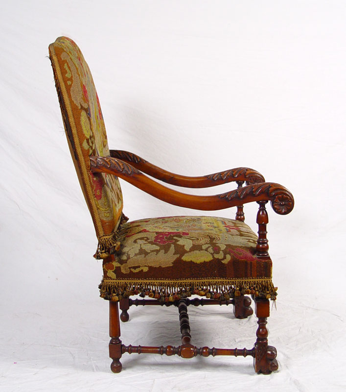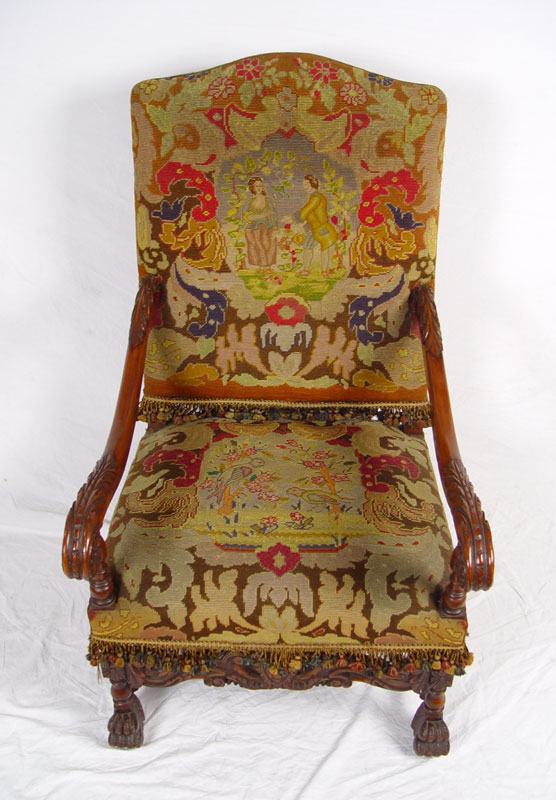 19TH C. CARVED AND UPHOLSTERED THRONE CHAIR: Needlepoint covered back and seat trimmed in tassels. Carved arms with acanthus leaf design and rolled arm. Turned and carved paw leg and foot with turned stretcher. 45'' h. x 26'' x 30''.