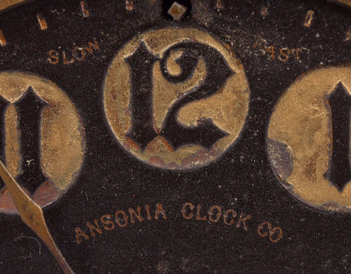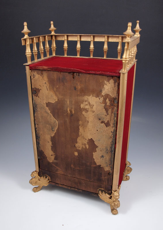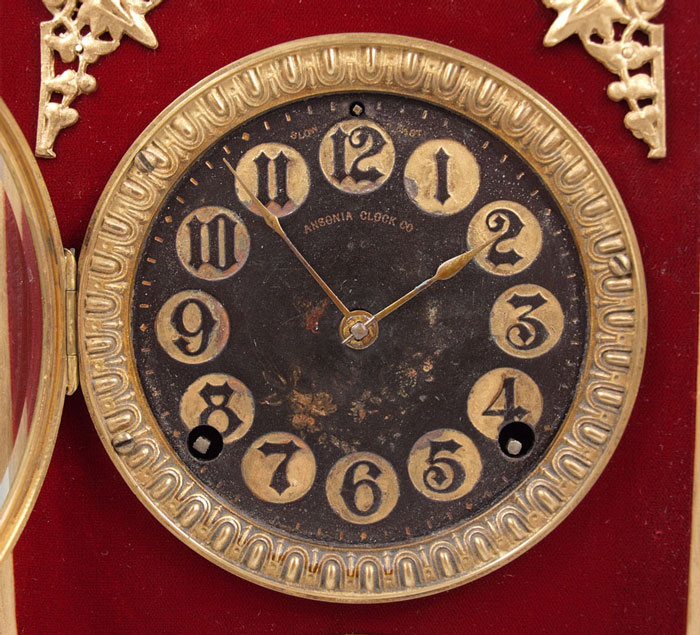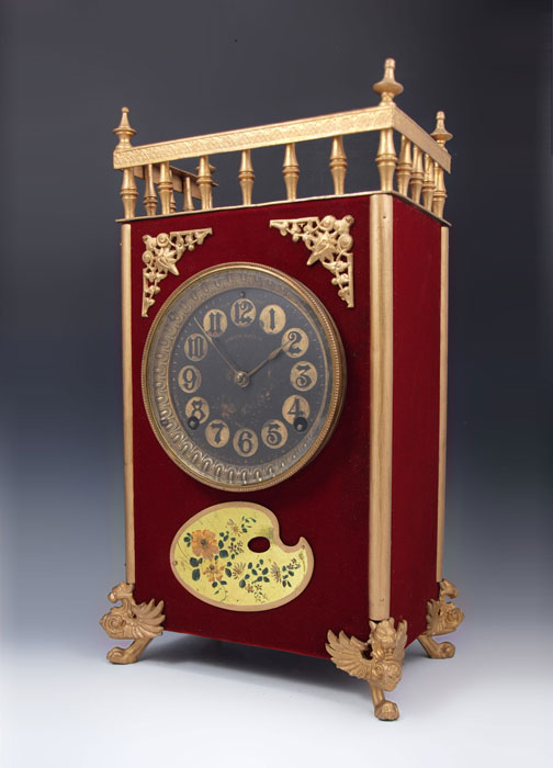 ANSONIA FLORENTINE RED VELVET CLOCK: Cast metal cast with gallery, griffin feet, corner decoration and hand painted plaque in form of artist easel with floral decoration. Case is covered in red velvet. Metal face with Arabic numerals, some hand painted floral motif remains. Beveled glass bezel. 15 3/4'' h. x 9 1/8'' x 6''. Key & pendulum in office.