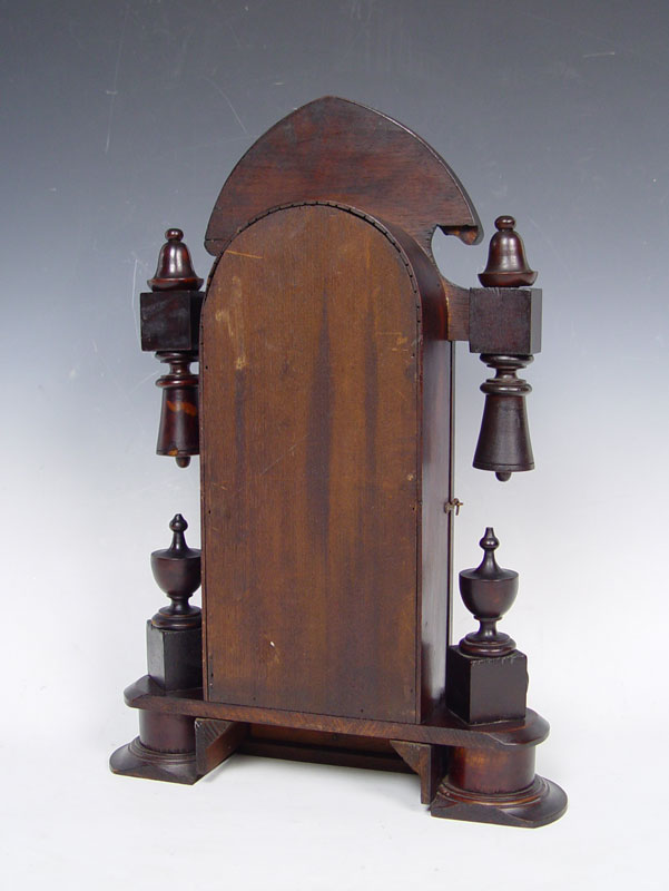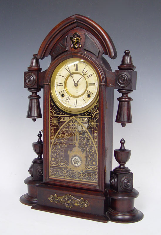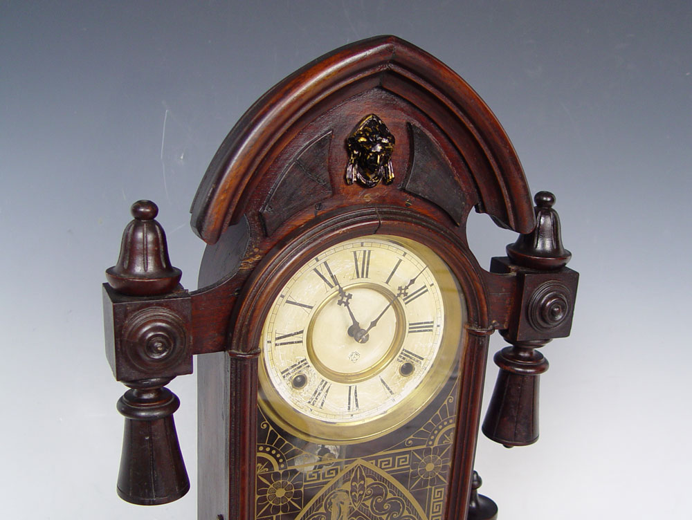 ANSONIA EMPIRE STYLE TEARDROP CLOCK: Wood case with turned and carved ornamentation and applied metal masqueron. Reverse painted front glass, Paper over metal face with roman numerals. 22'' h. x 15 1/2'' x 5 3/4''. Key & pendulum in office.