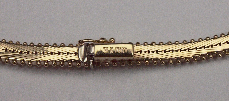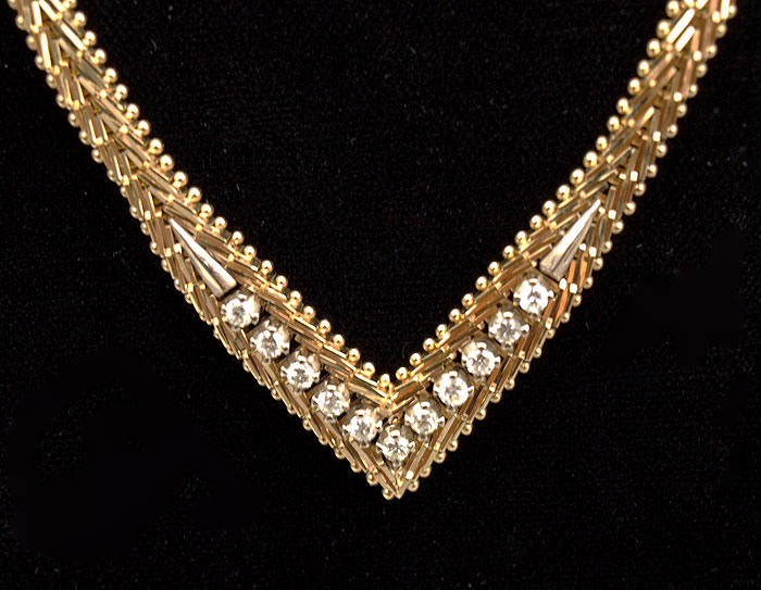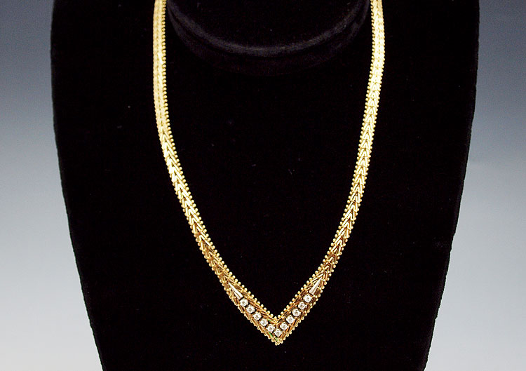 14K DIAMOND V NECKLACE: 14K yellow gold link necklace contains eleven round brilliant cut diamonds. Weight: .50 Ct. Approx. The diamonds average VS-SI in clarity and H-I in color. The diamonds are prong set. ''V'' shaped. Length: 16'' Weight: 31.4 grams.