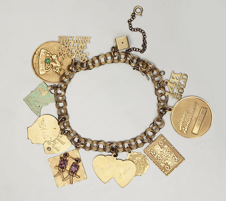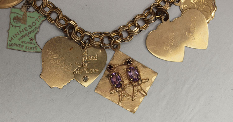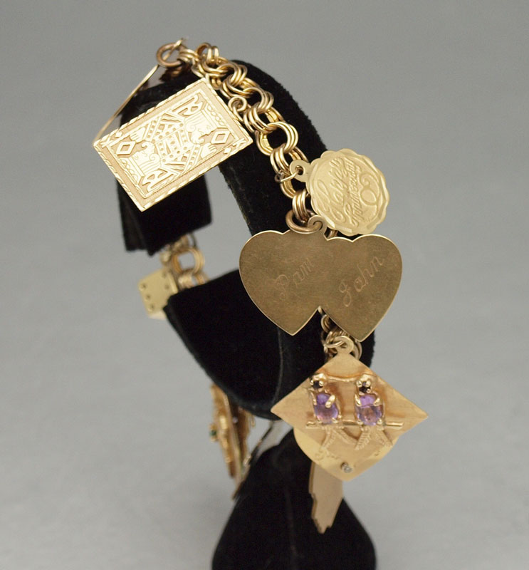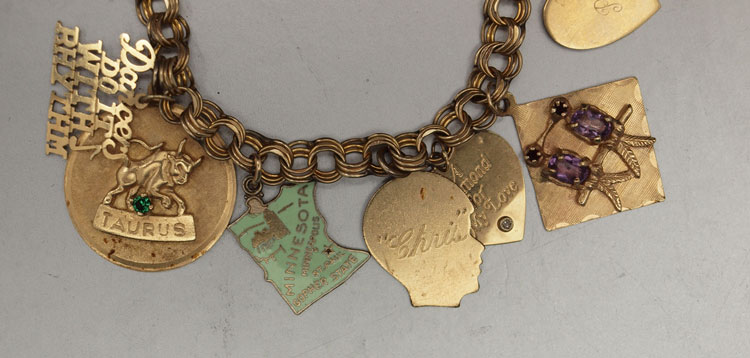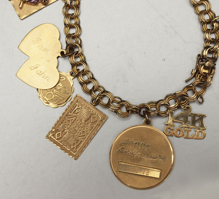 14K CHARM BRACELET WITH CHARMS: 14K triple circle link charm bracelet with 11 14K charms and one sterling char,. Weight: 31.1 grams. Length: 7''