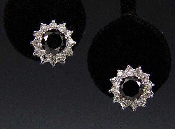 18K BLACK AND WHITE DIAMOND EARRINGS: 18K white gold earrings centering 2 round full diamonds, approx total 3.07 ct., black in color. The black diamonds are framed by 24 old European round cut diamonds, approx. 1.01 Ctw., averaging VS in clarity and H-I color. Total diamond weight is 4.08 Ct. All stones are prong set. Post and 14K nut closure. Weight 6.5 grams. Sold with current Atlanta Gemological Laboratories GIA graduates appraisal for $6250.