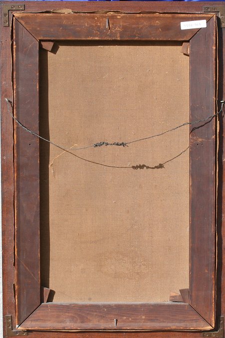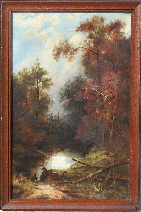 19TH C. OIL/CANVAS OF FISHING HOLE WITH ANGLERS: 22'' x 14'', framed 24'' x 16'', no visible signature.