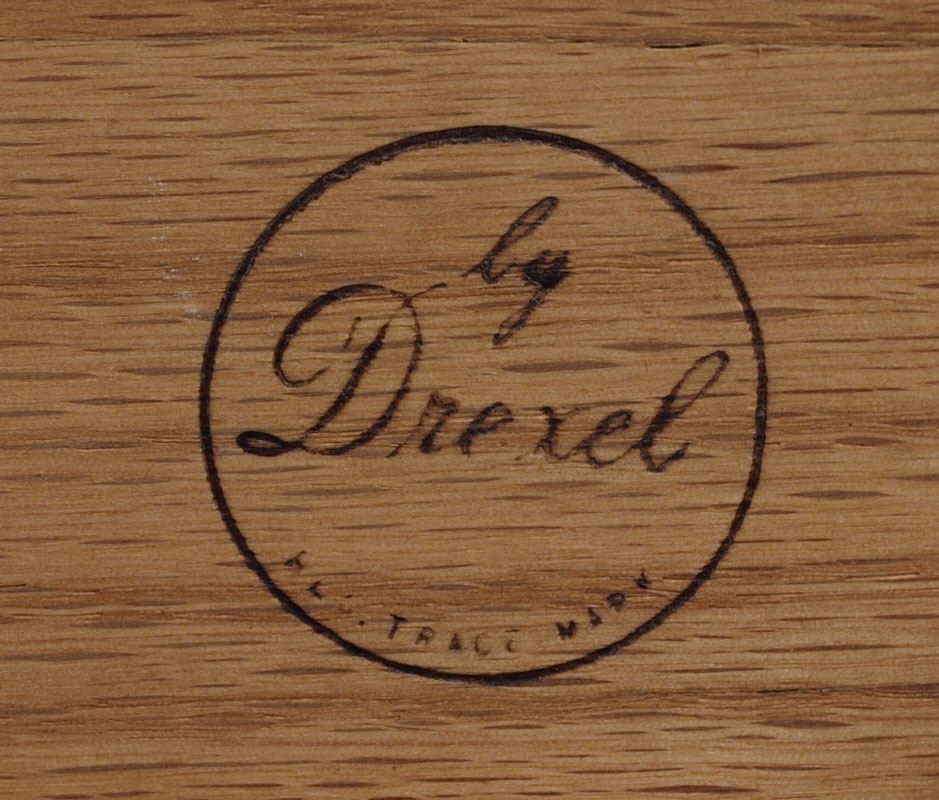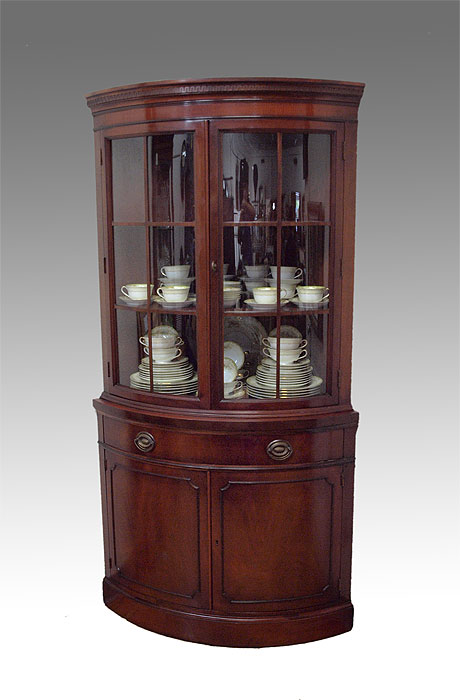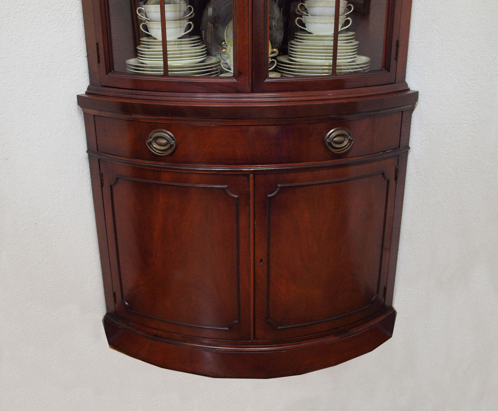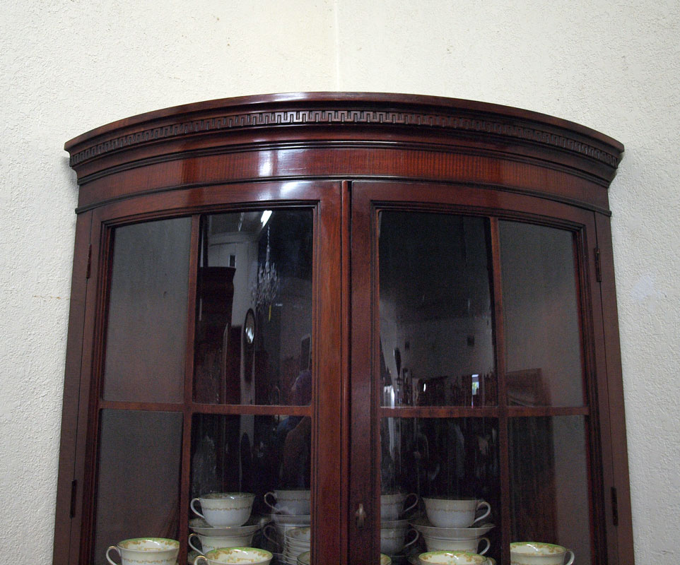 DREXEL TRAVIS COURT MAHOGANY CORNER CUPBOARD: Molded top with Greek key design. 2 glass doors with 6 window lights and 2 interior shelves. Single drawer over 2 doors with applied molding panels. 70'' h. x 36'' x 20''.
