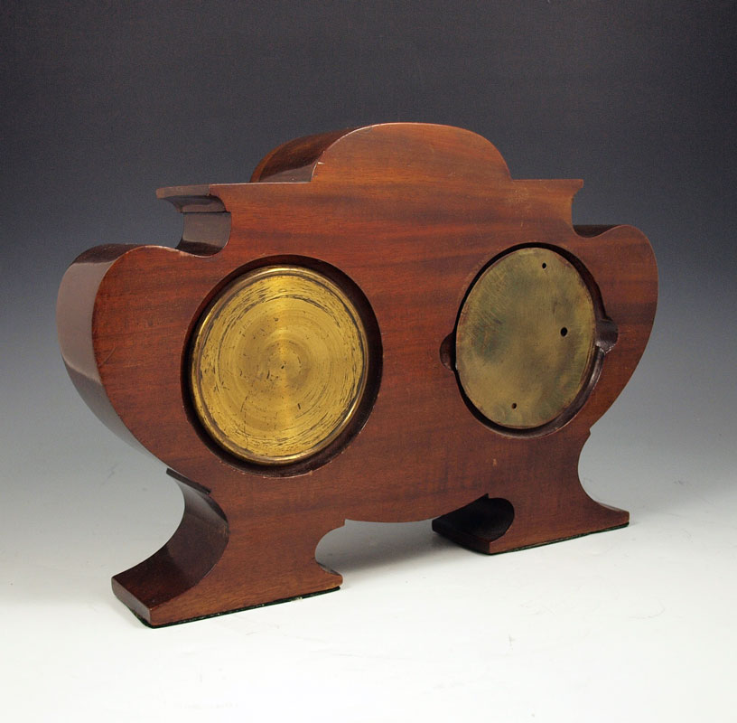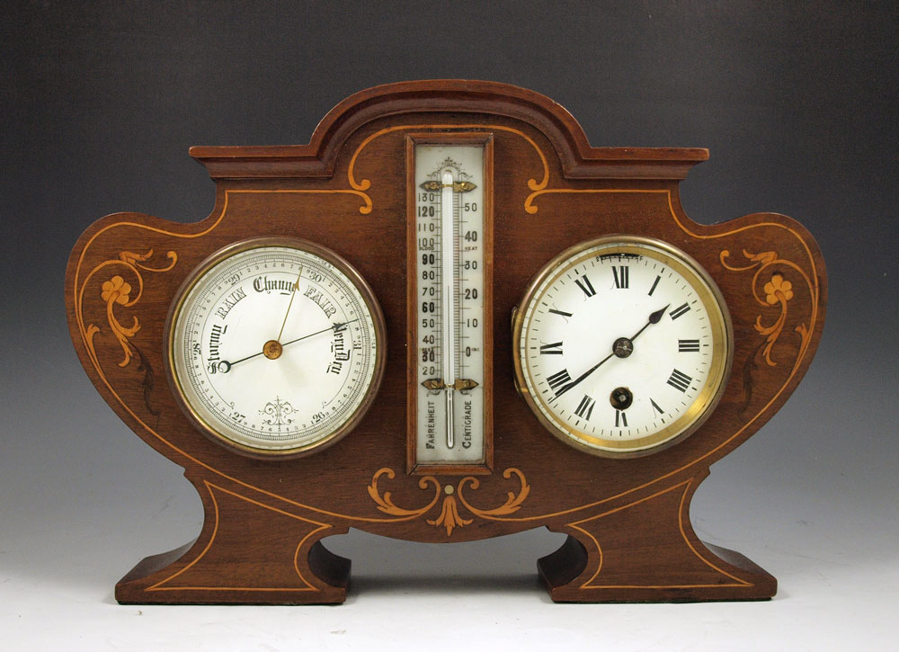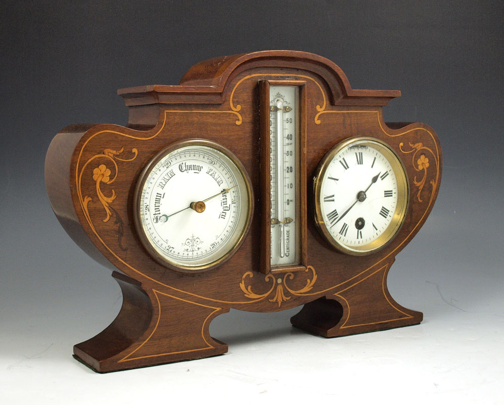 FRENCH INLAID DESK CLOCK WEATHER STATION: Floral and string inlay French desk clock with barometer and thermometer. Beveled glass bezels. Time only key wind movement. 9'' h. x 13 1/2'' x 2 3/4''. Key in office