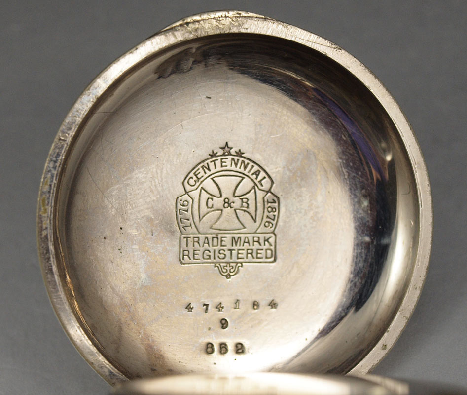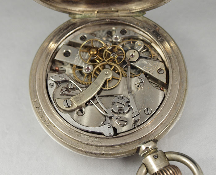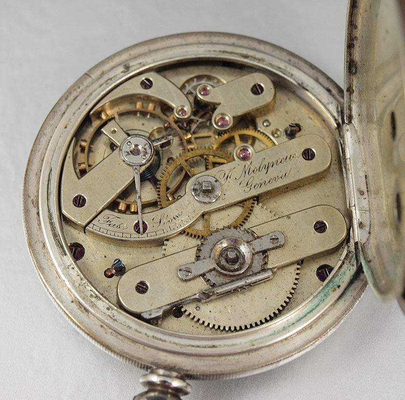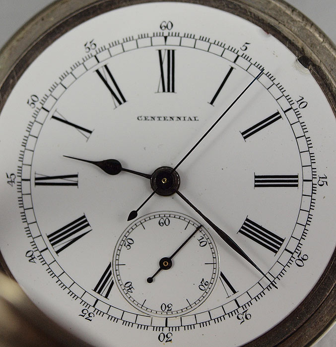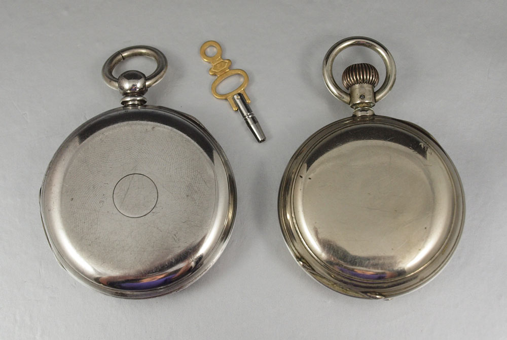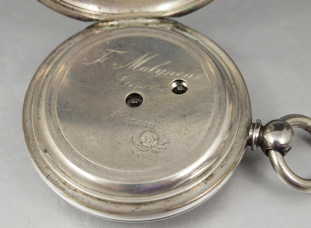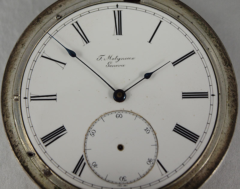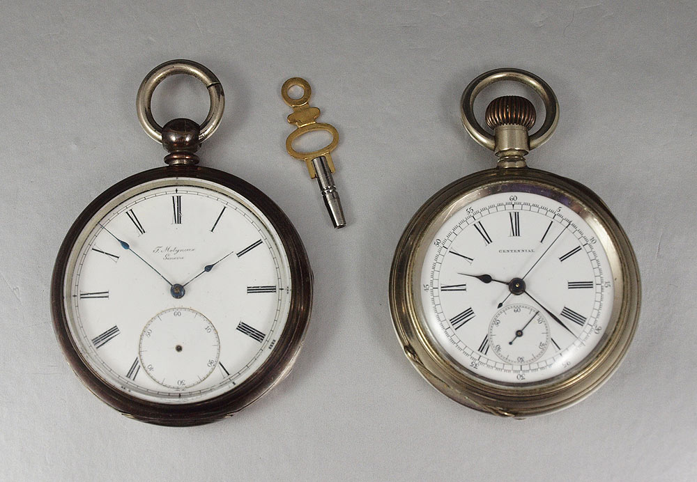 TWO ESTATE SWISS POCKET WATCHES: Circa 1880 Swiss made CENTENNIAL CHRONOGRAPH in original nickel case, special dust cover, lever set movement, 18 size 52mm, replacement hands, needs cleaning but then should run great. And Circa 1870 Swiss made T. MOLYNEUX in Fine Silver Case, key wind and set, replacement key, 20 size 55mm, original dial in good condition, single sunk style, name on dial matches name on movement, needs cleaned and replacement of second hand, crystal scratches are minor and can be cleaned. Sold as a lot.