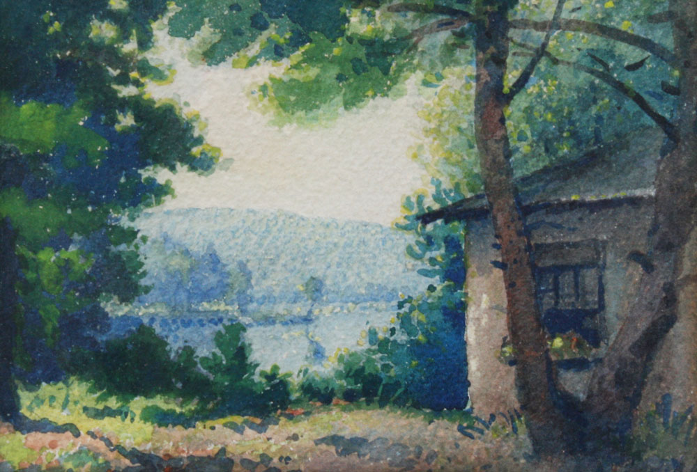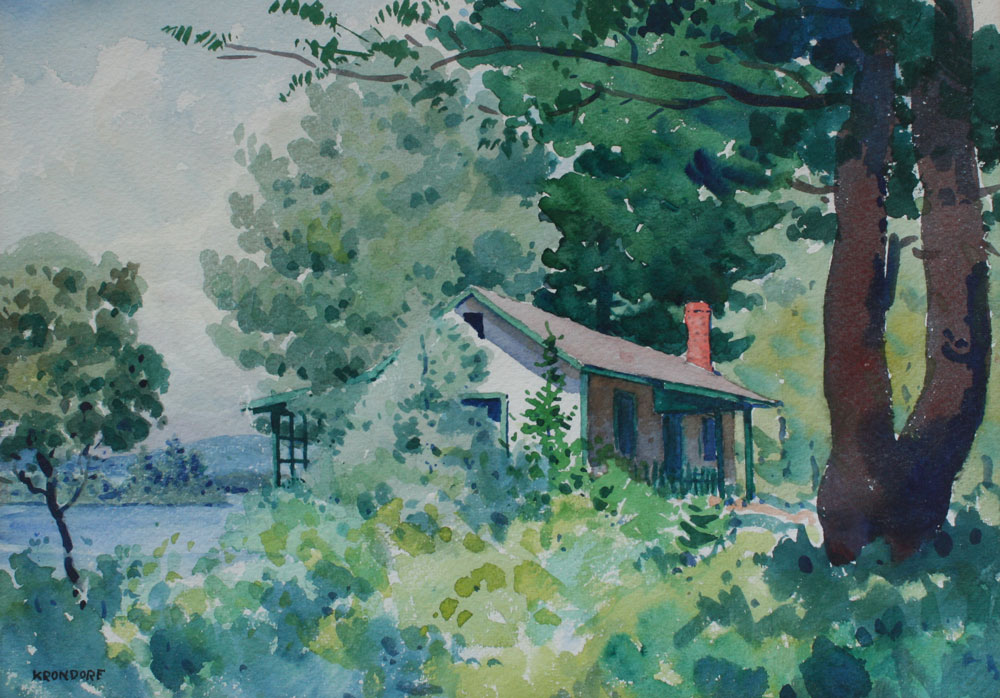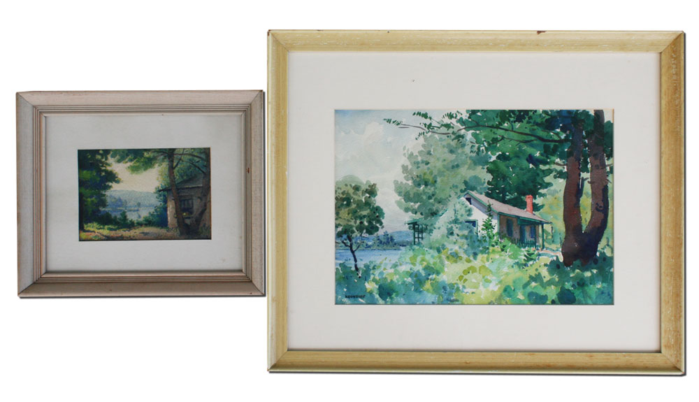 KRONDORFF, William, (American, 1877-1968): Two watercolors- ''Mother and Pappy's Sunset Cottage at Cobb Lake, New Hampshire, 1961,'' sight size 9 1/2'' x 13 1/2'', watercolor, framed 16 1/2 x 20'', signed lower left. ''Dirthard's Sunset at Cobb Lake, New Hampshire, 1961,'' sight size 4 1/4'' x 6 1/2'', monogrammed lower right, framed 10'' x 12''.