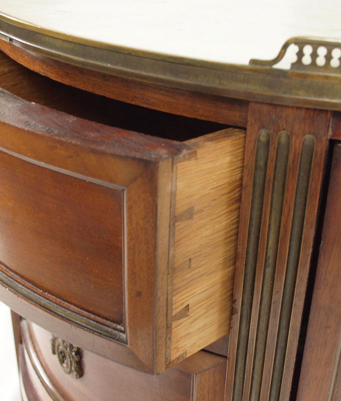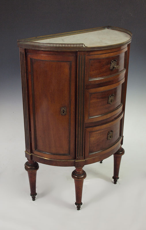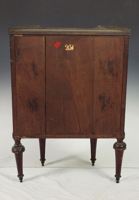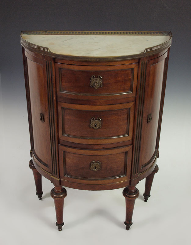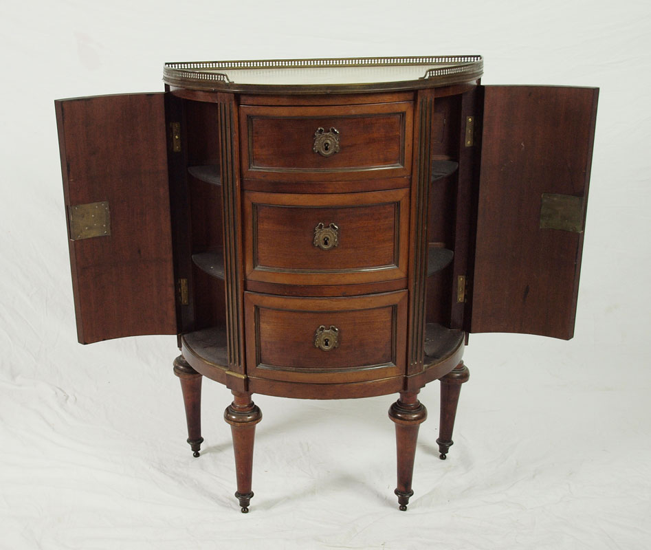 DIMINUTIVE MARBLE TOP COMMODE: 3 central drawers flanked by 2 curved side doors, reticulated brass gallery, ormolu mounted rail. Key in office. 34 5/8'' h. x 25 3/4'' x 12 1/4''.