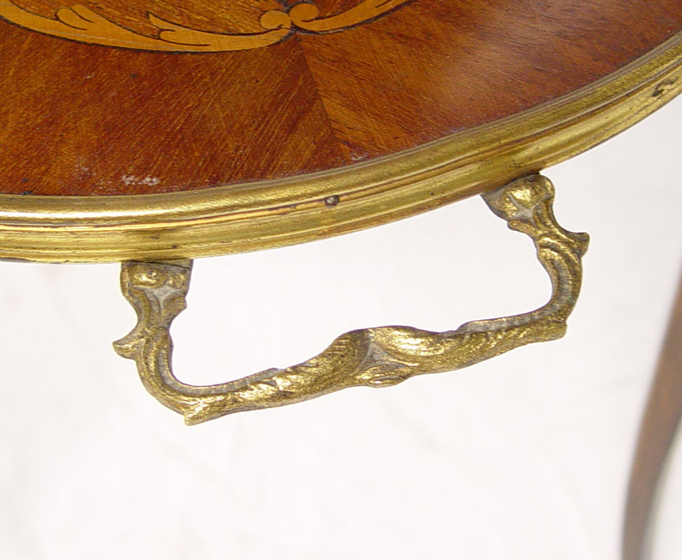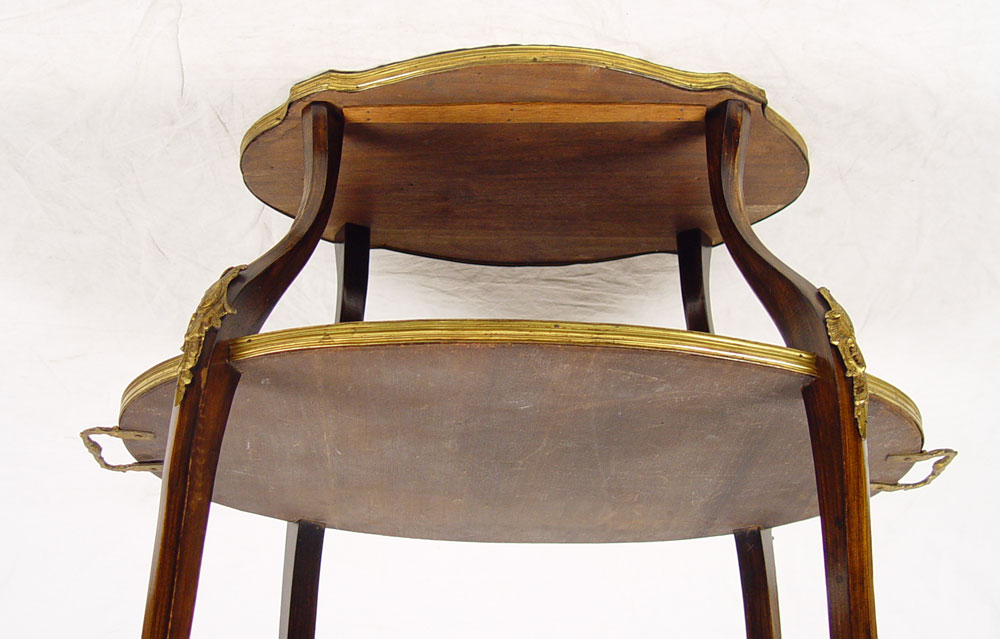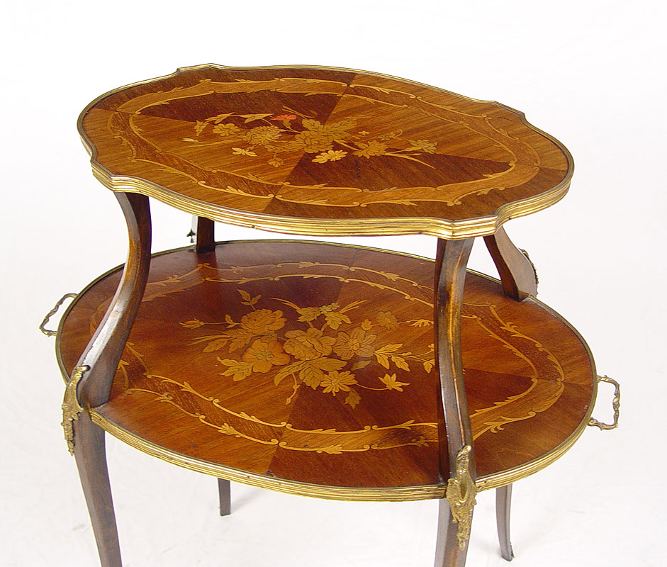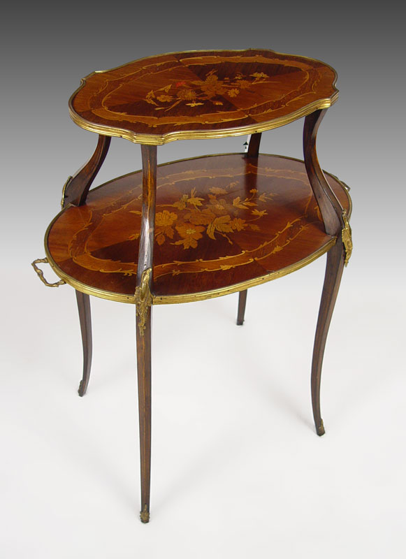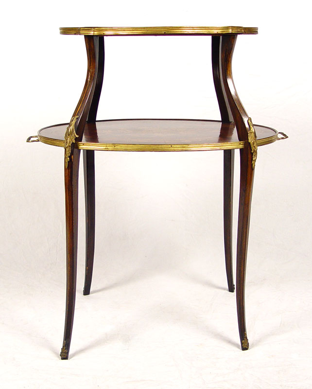 MARQUETRY INLAY 2 TIER FRENCH TABLE: Brass edge detail, ormolu mounts on the cabriole legs. 34 1/2'' h. x 28 3/4'' x 17 3/4''