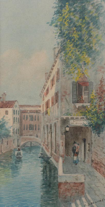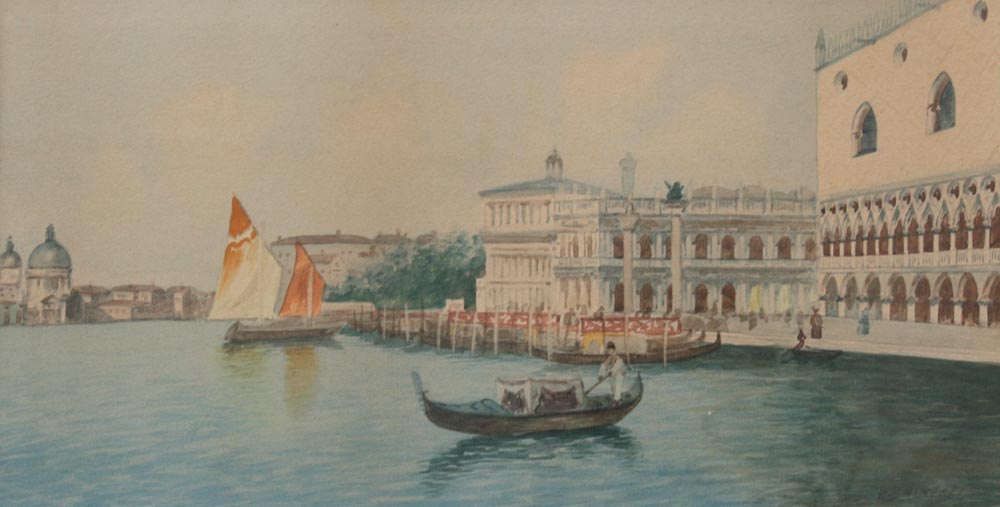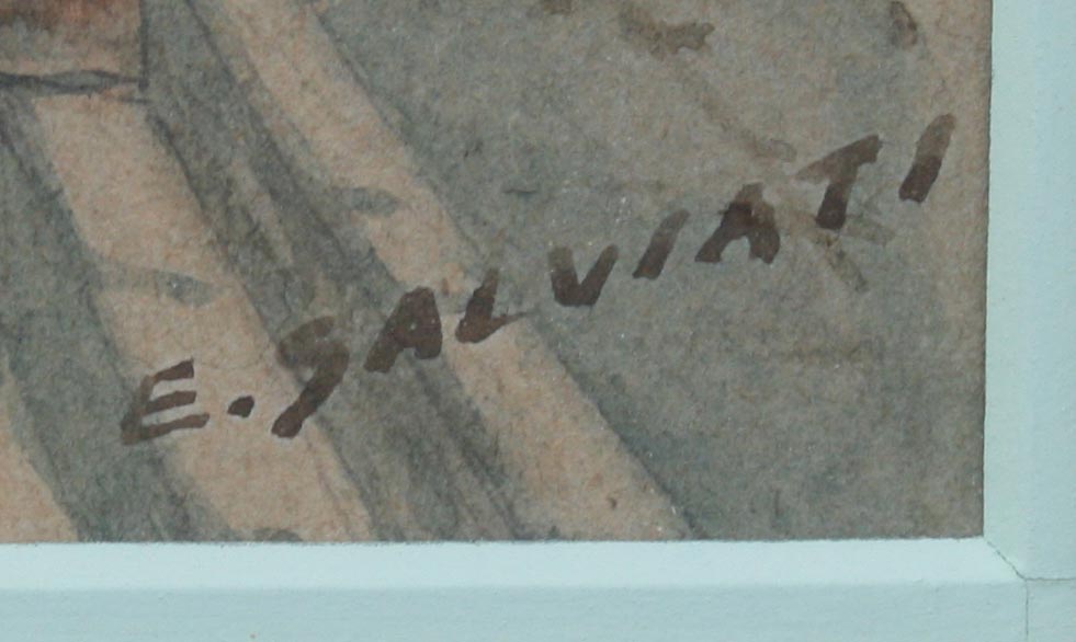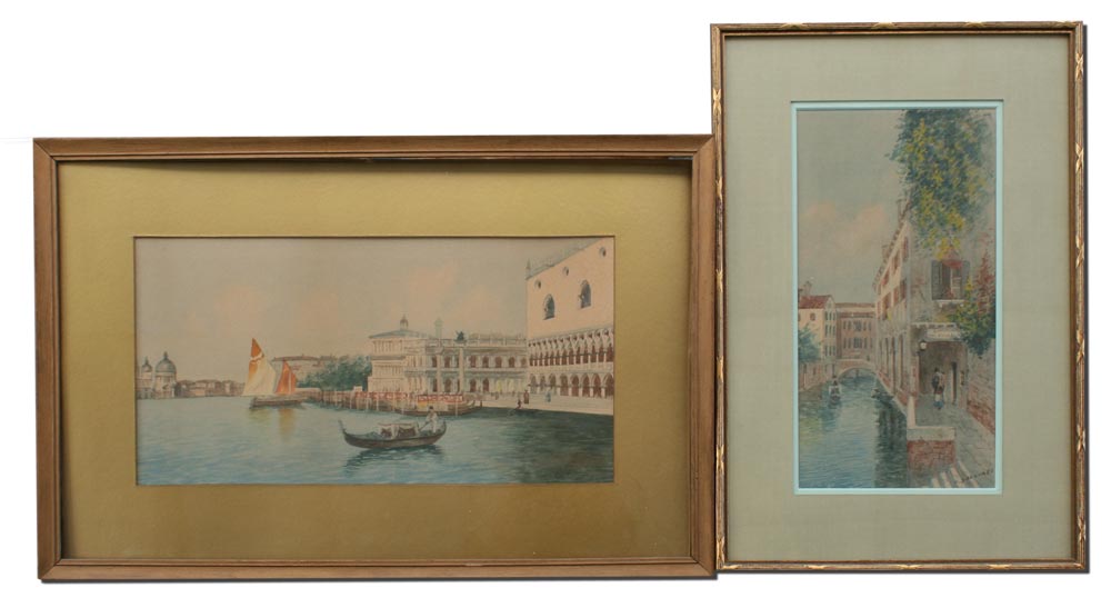 TWO SALVIATI VENETIAN WATERCOLORS: Vertical one has sight size 12 1/2'' x 6 1/2'', signed, framed 18'' x 12''. Grand canal painting has sight size 8'' x 15 1/2'', signed, framed 14 1/2'' x 22''.