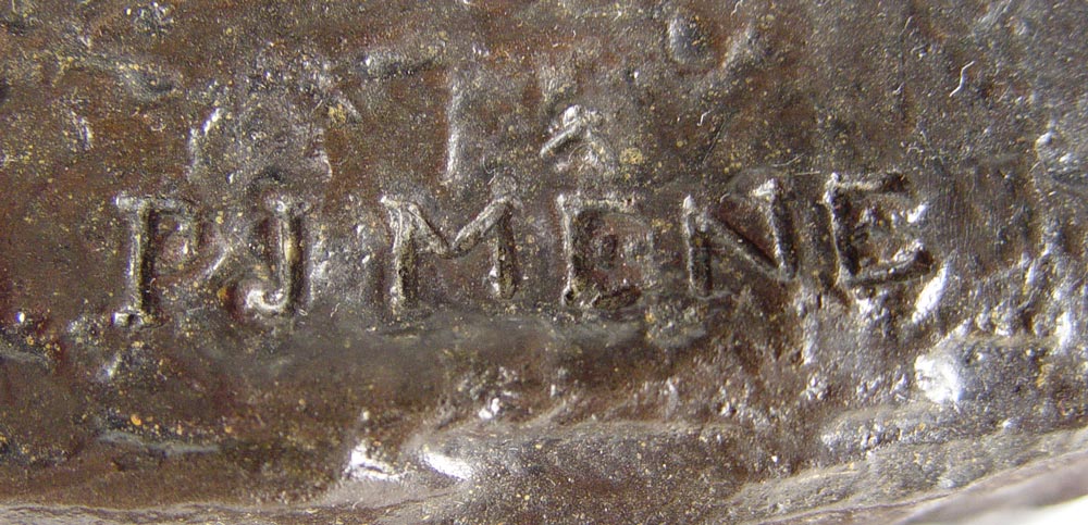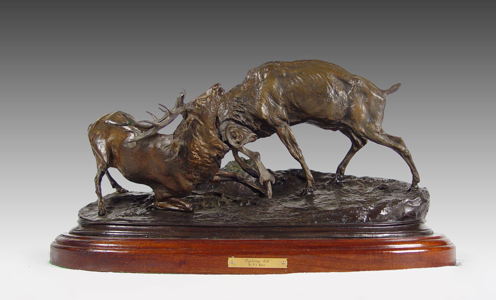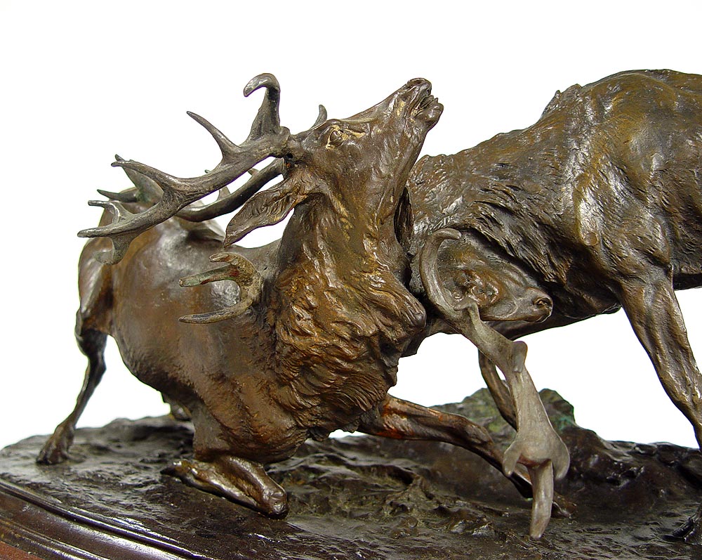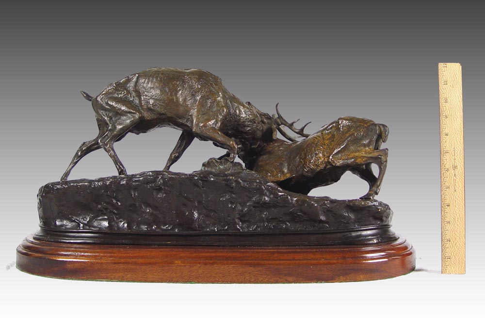 FIGHTING STAG PATINATED SCULPTURE AFTER MENE: approx 11'' h x 22'' w, wooden plinth 12'' h x 24'' overall width.