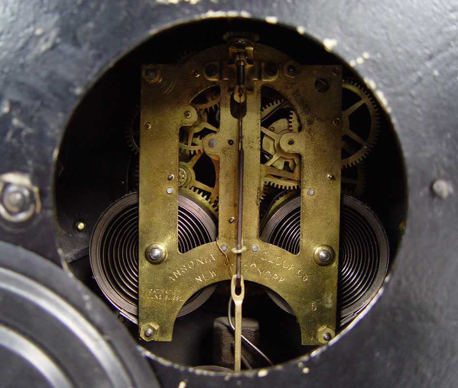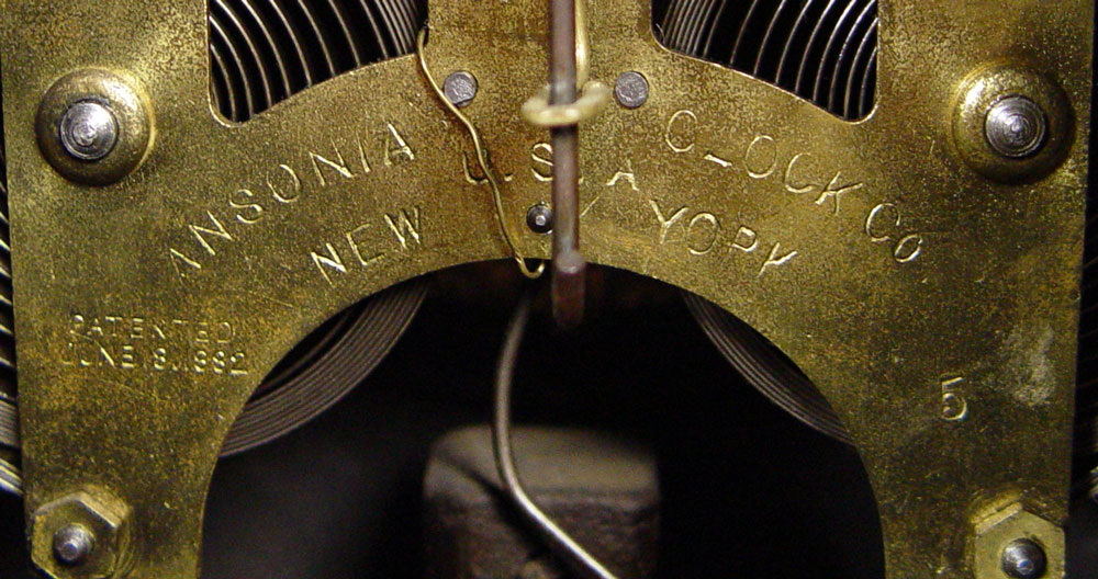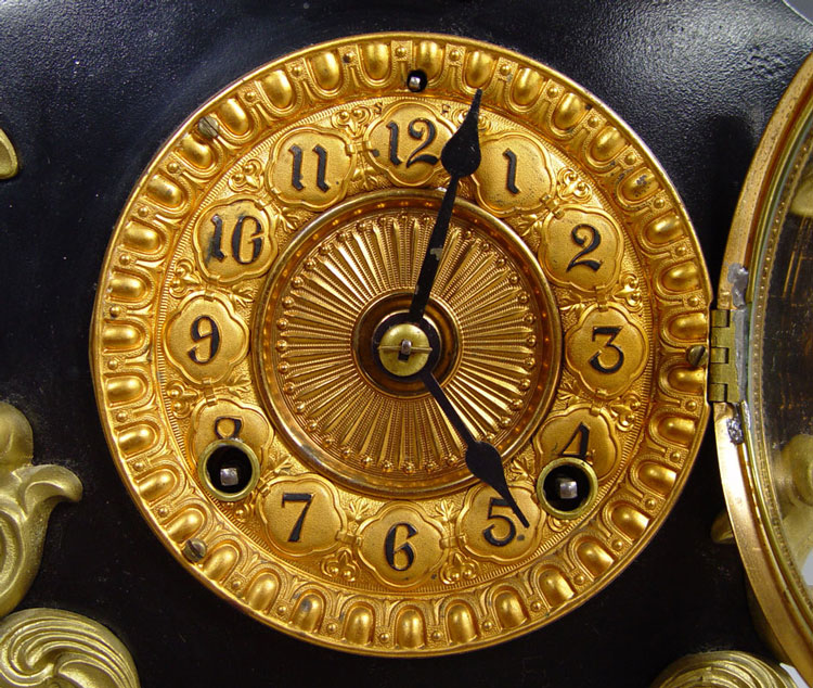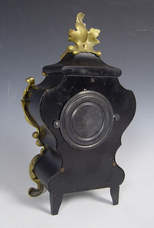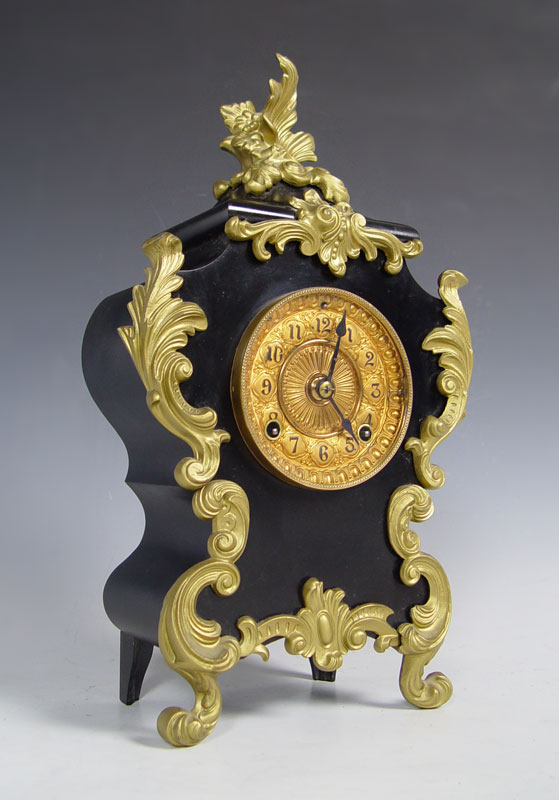 ANSONIA CAST IRON SHELF CLOCK: Cast iron body with ormolu style applied decoration. Metal face with Arabic numeral. Ansonia time & strike movement. 18'' h. x 10 1/4'' x 5 1/2''. Key & pendulum in office.