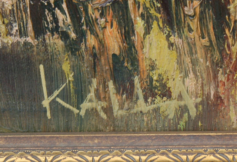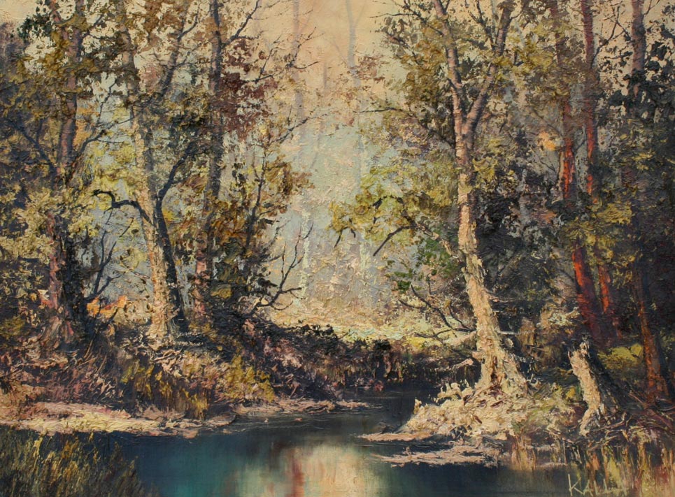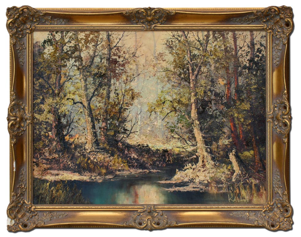 KALLA, (): Forest Landscape with Stream, OIL/Canvas, 24'' x 31 1/2'', gilded and carved frame 29 1/2'' x 37''.