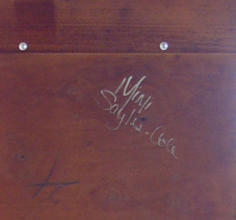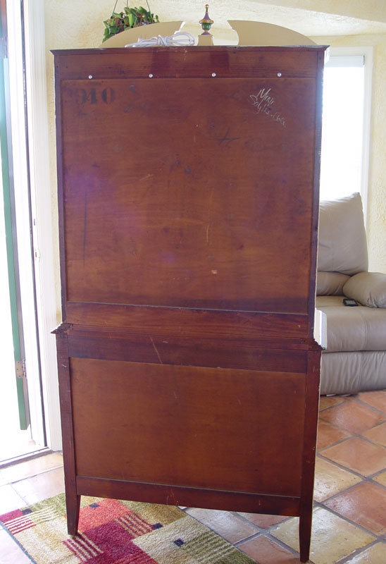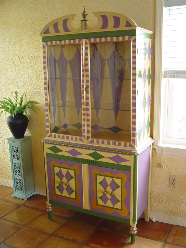 MIMI SAYLES COLE WHIMSICAL PAINTED DISPLAY CABINET: Double glass door top with 2 interior glass shelves on a 2 door base with turned legs, broken arch pediment with finial, overall painted in a playful purple, green & gold over a cream ground, 74 1/2'' h. x 36'' x 17''.