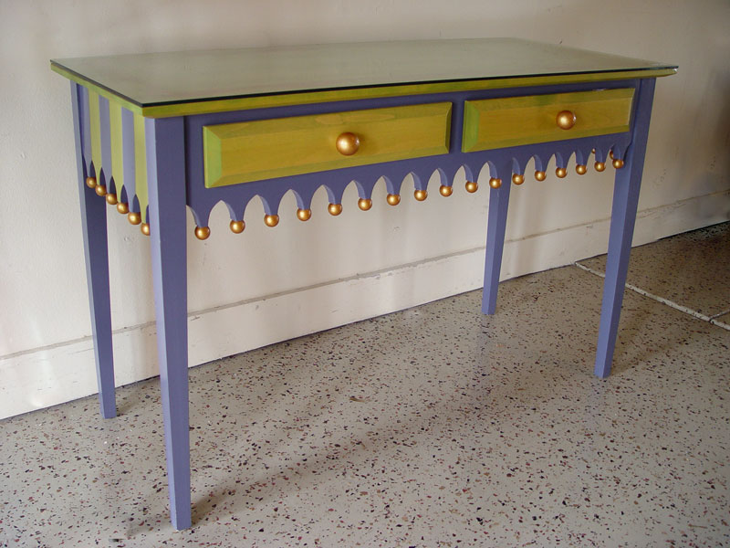MIMI SAYLES COLE PAINTED DECORATED 2 DRAWER SOFA TABLE: Tassel with ball drop finial design apron. Long tapered legs. 2 drawers with ball pulls and glass top. Overall painted in a playful purple, green and gold design. 30 1/2'' h. x 47'' x 20 1/2''.