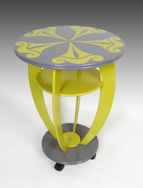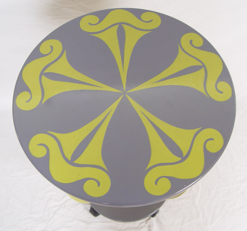 MIMI SAYLES COLE PAINT DECORATED ROUND TABLE: Unusual design with flat cut curved legs attached to lower disc on castors. Playful purple & green handpainted design. 32'' h. x 24'' dia.