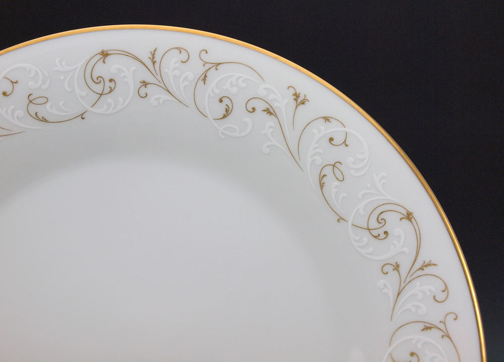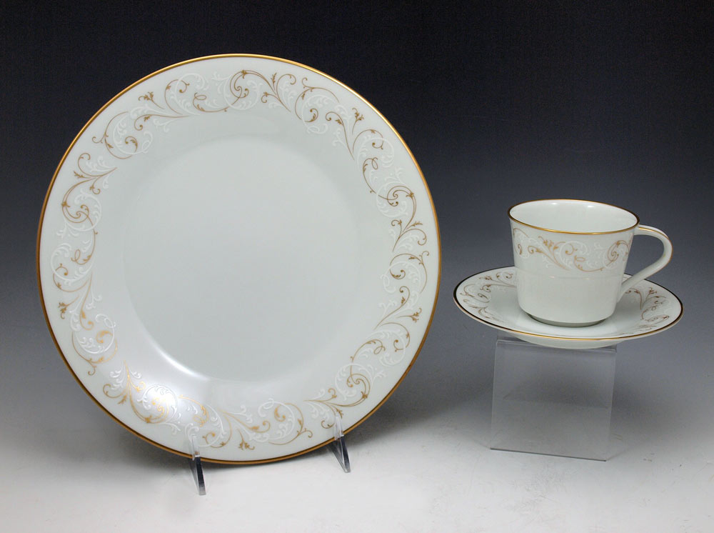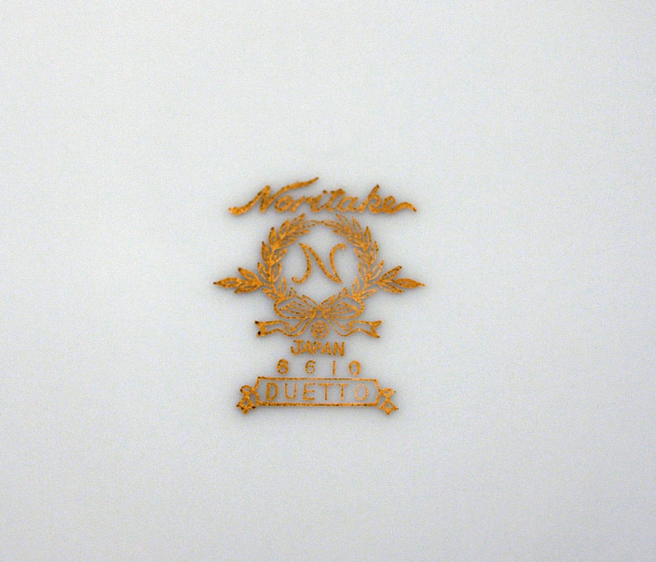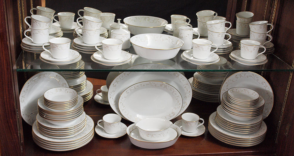 NORITAKE FINE CHINA IN THE DUETTO PATTERN: 93 piece service of twelve to include 12 dinner plates, 12 salad plates, 12 bread plates, 12 soup bowls, 12 dessert bowls, 14 cups & saucers, 2 oval platters, oval vegetable, round vegetable, cream & sugar, and gravy.
