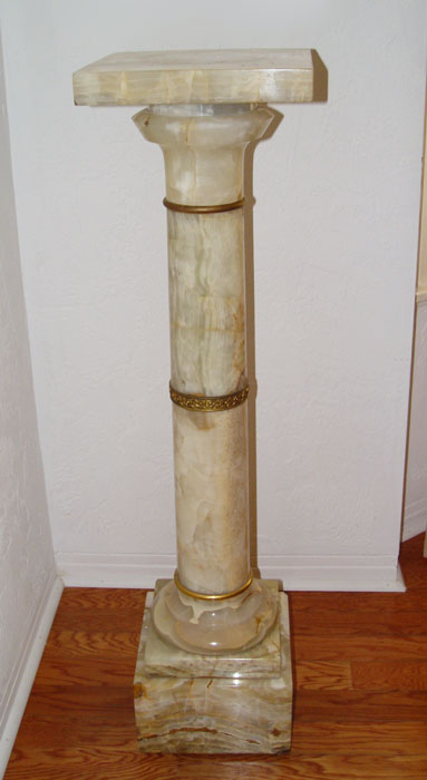 CREAM AND GREEN MARBLE PEDESTAL: Swivel top on cylindrical column on square base. Decorated with brass trim. 42'' h. x 11'' square.