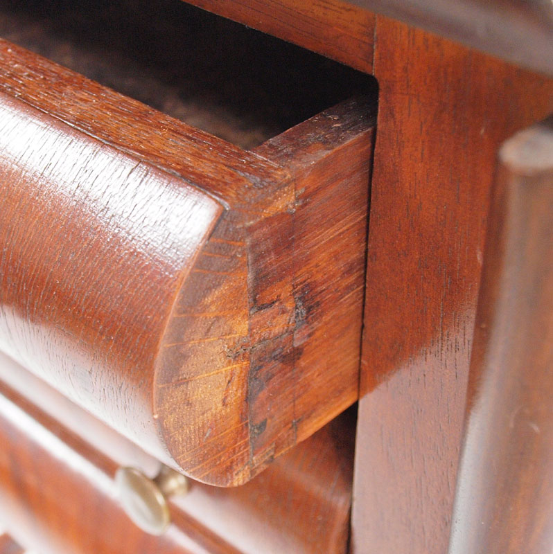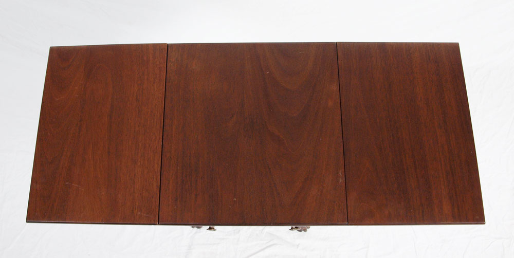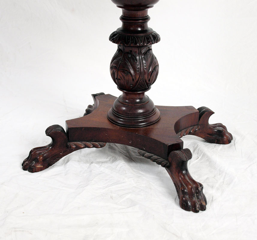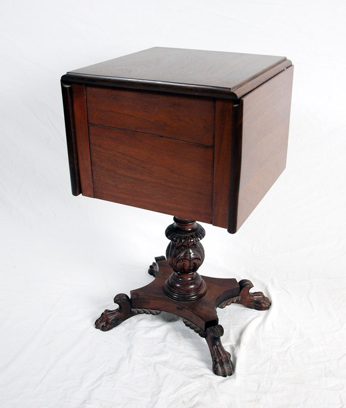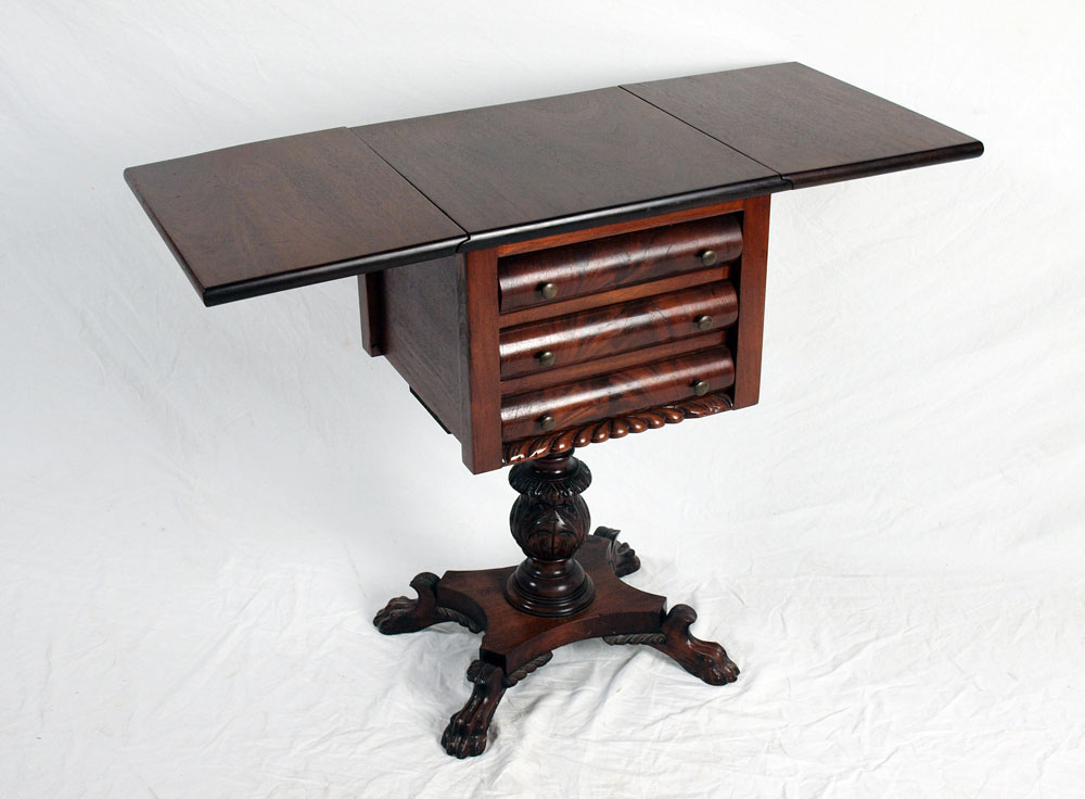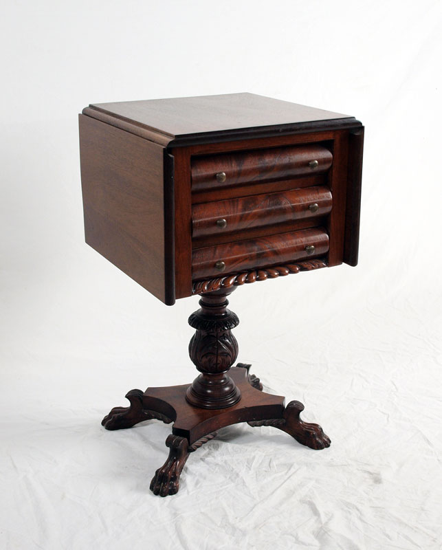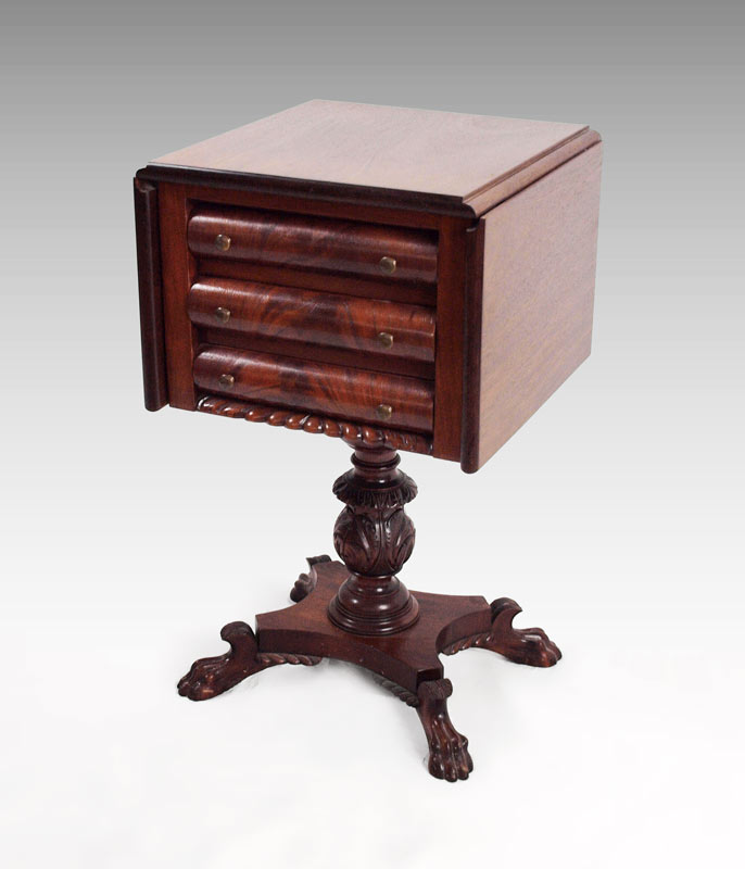 EMPIRE PERIOD 3 DRAWER WORK STAND: 3 curved drawers with brass pulls. Central turned and carved pedestal on base with paw feet. Approx. 29''h. x 16'' x 16'', extends to 37'' with leaves up.