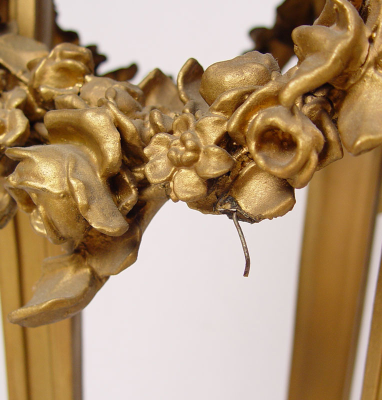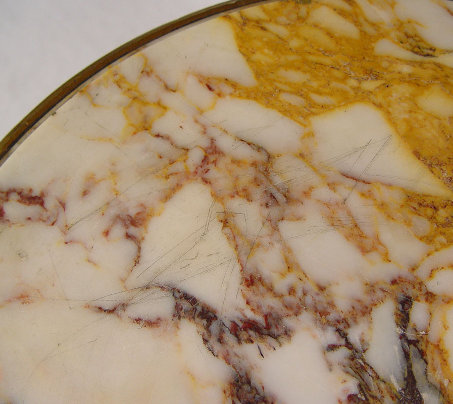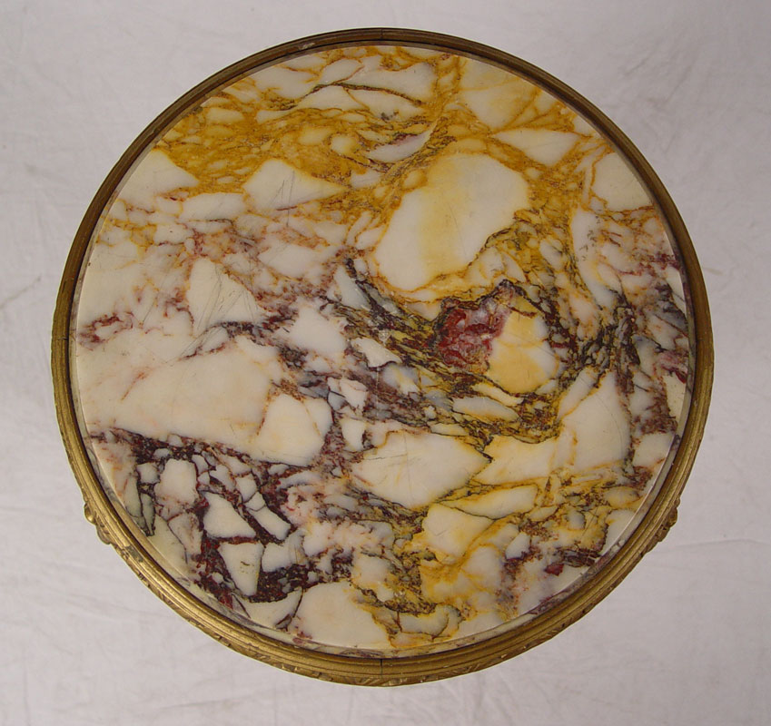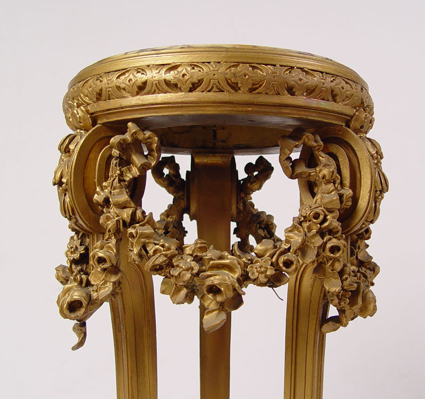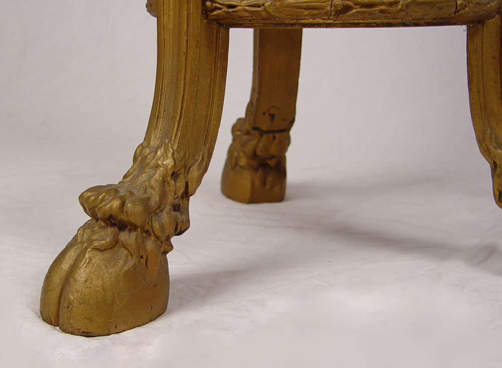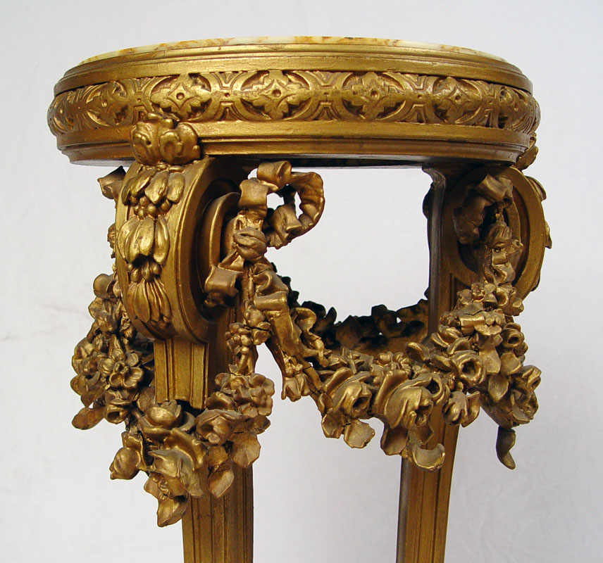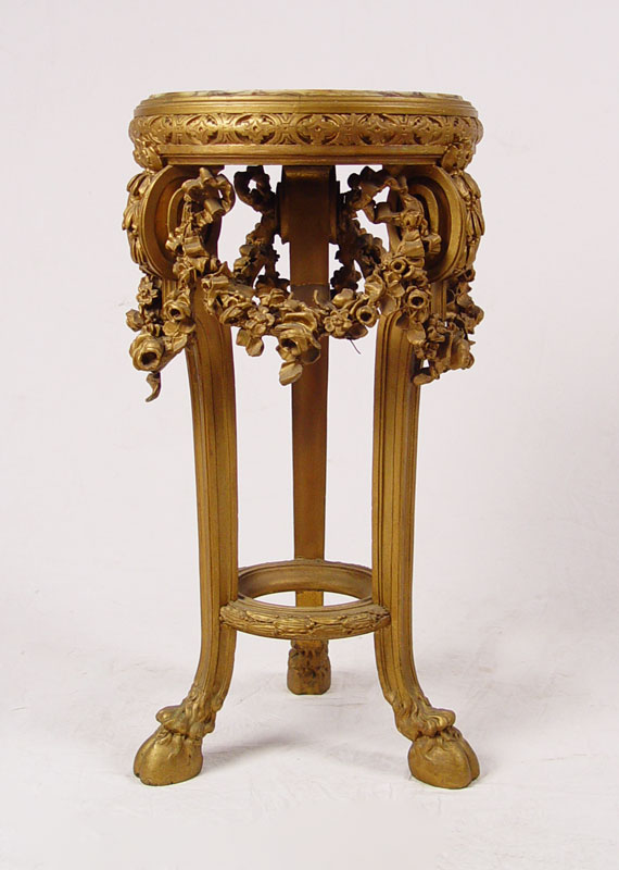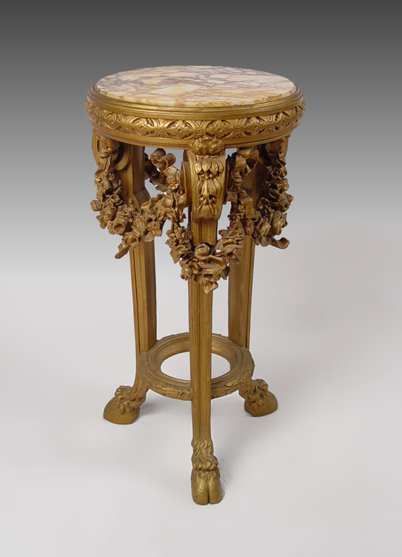 CARVED & GILT WOOD MARBLE TOP STAND: Round marble top on three carved and gilt legs with cloven hoof. 3 dimensional carved floral swag connection the legs. Carved laurel wreath between legs. All in aged gilt finish. 30'' h. x 15'' round.