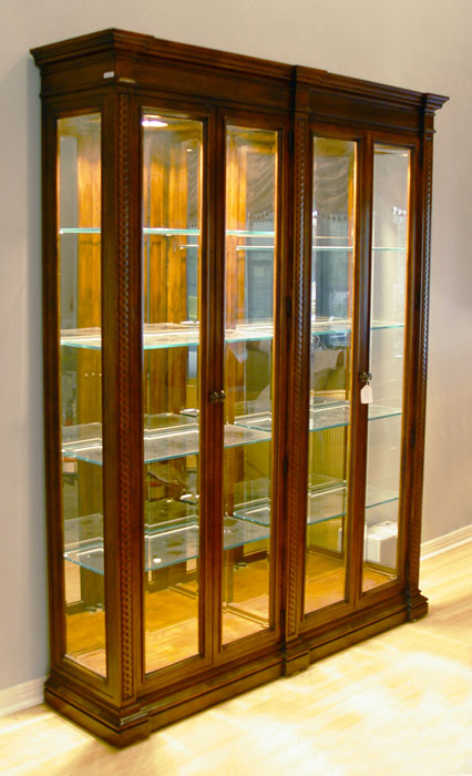 HENREDON DOUBLE WIDTH CURIO DISPLAY CABINET: Illuminated interior with glass shelves and mirror back. Beveled glass doors and side panels. Approx. 7 ft tall x 5ft 7 inches x 16 inches.