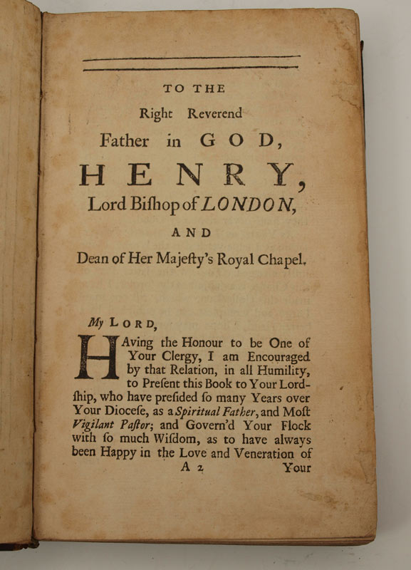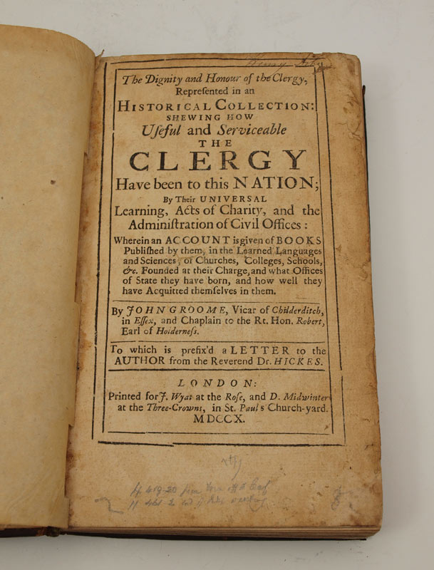 GROOME, John: ''The Dignity and Honour of The Clergy'', 1710 edition with preface by a letter to the author by Dr. Hicks. Printed for F. Wyat at the Rose and D. Midwinter at the Three Crowns in St. Pauls Churchyard. Leather bound. 460 pages including index. From the John Matter Collection. 1 1/4'' x 8'' x 5''.