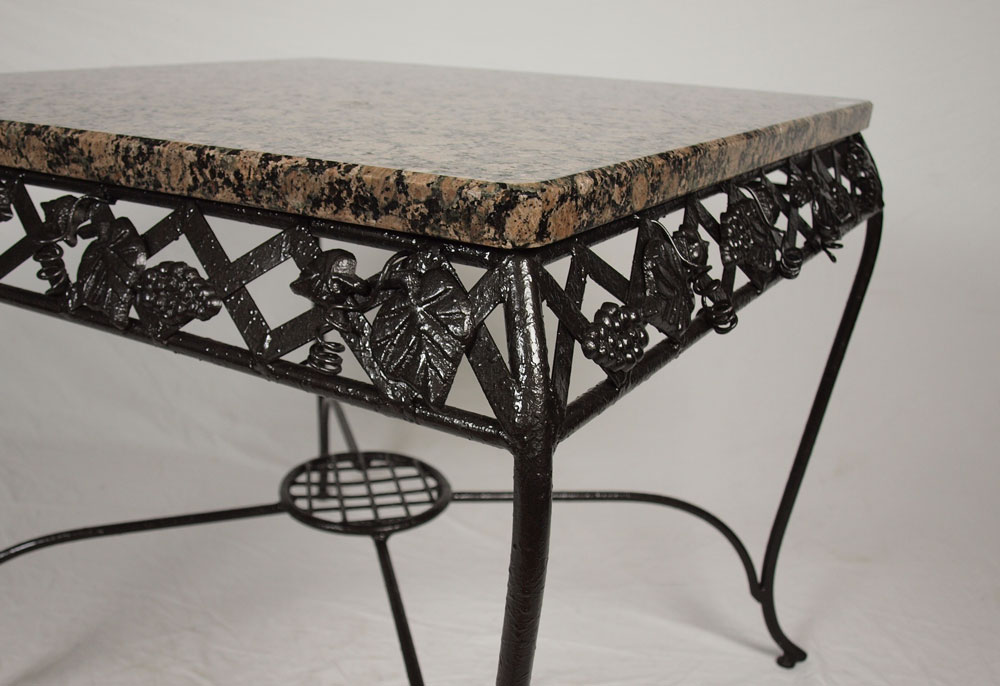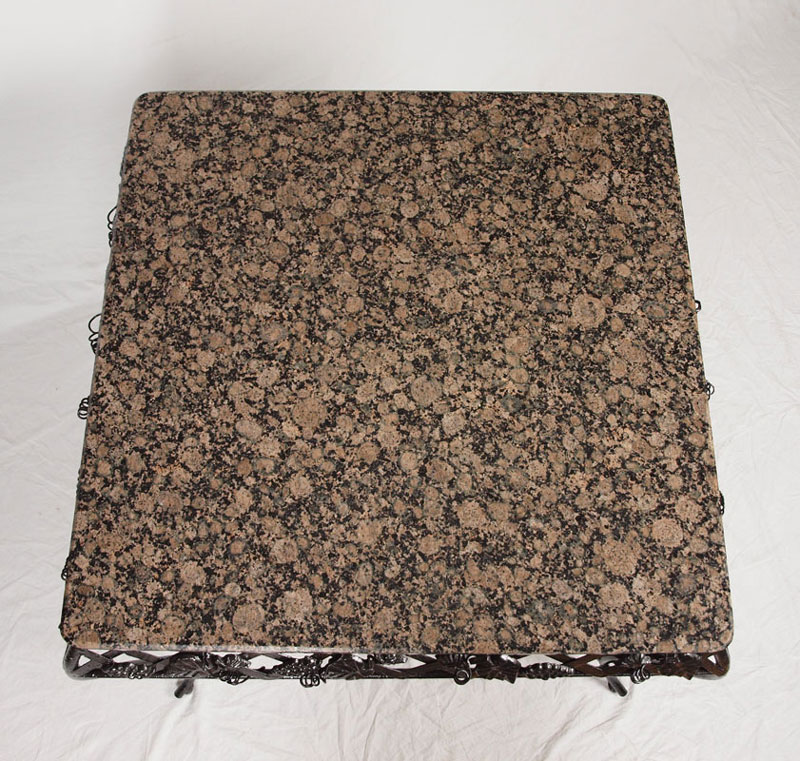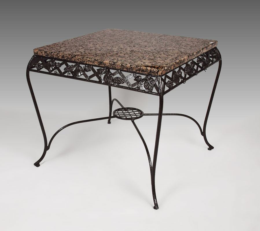 WROUGHT IRON TABLE WITH GRANITE TOP: Classic lattice & grape vine design, raised stretcher with round central shelf. 30 1/4'' h. x 34'' square. Great for wine tasting or as a pastry table.