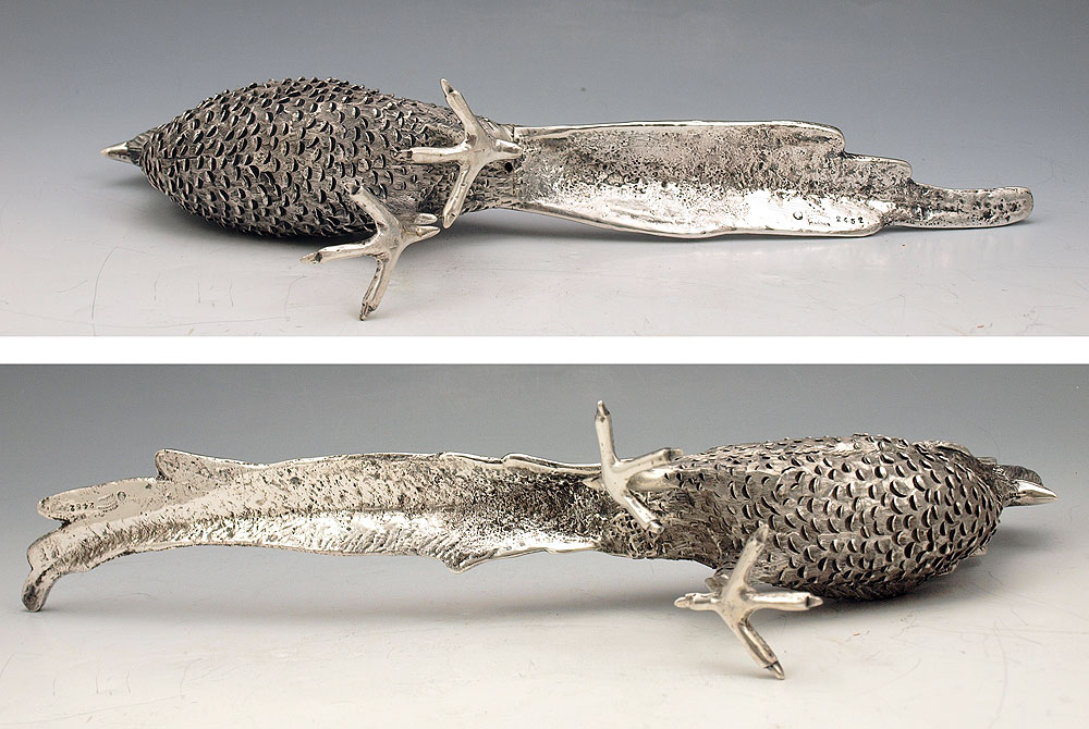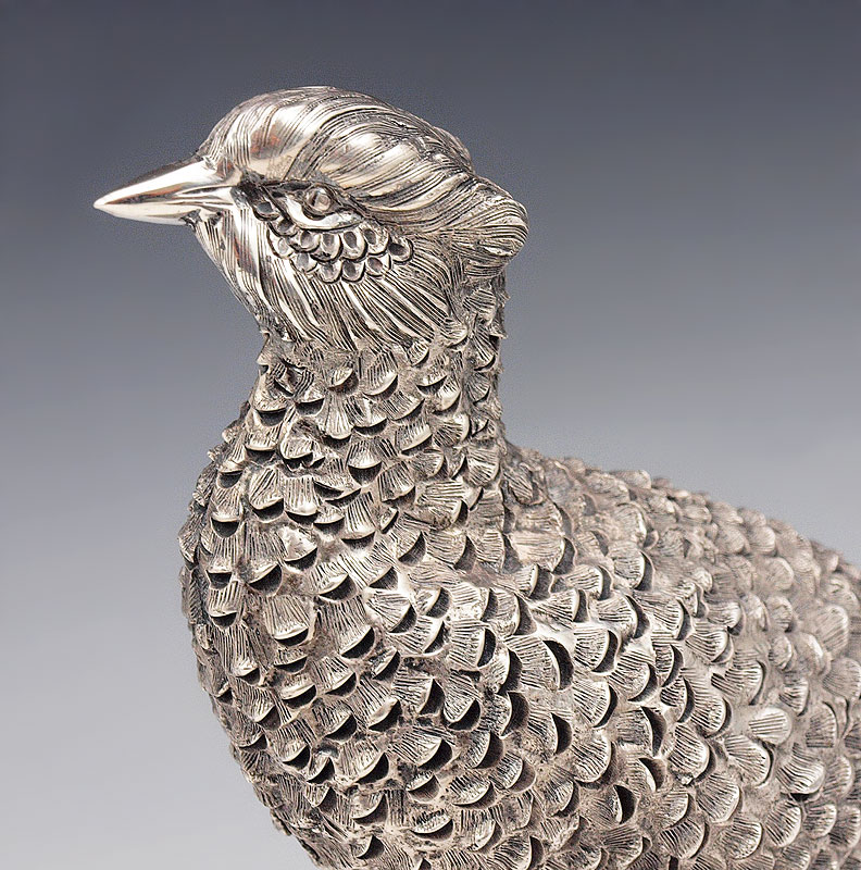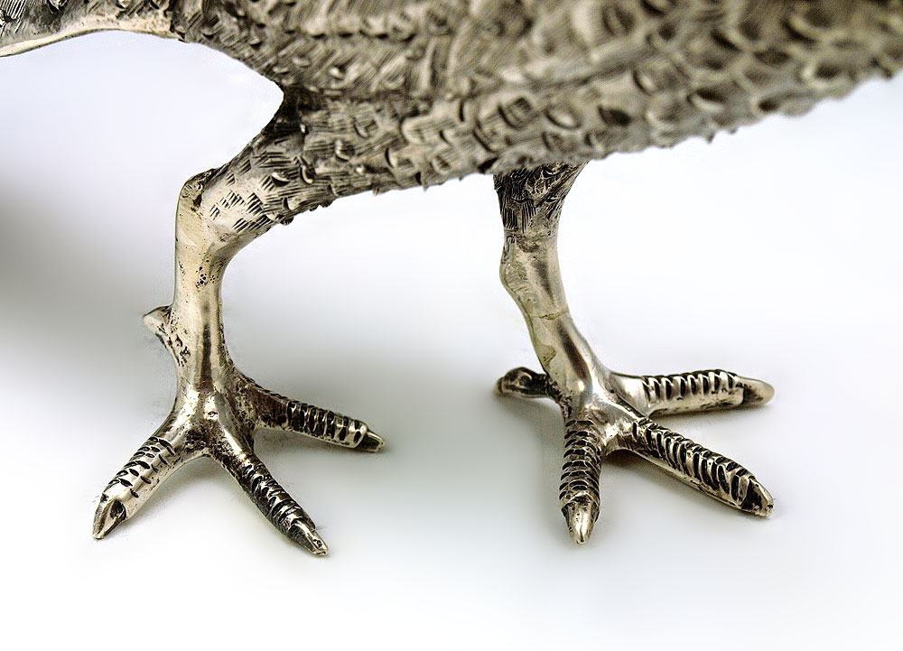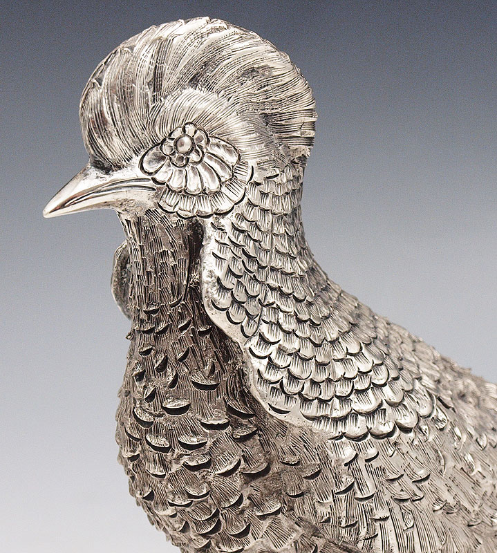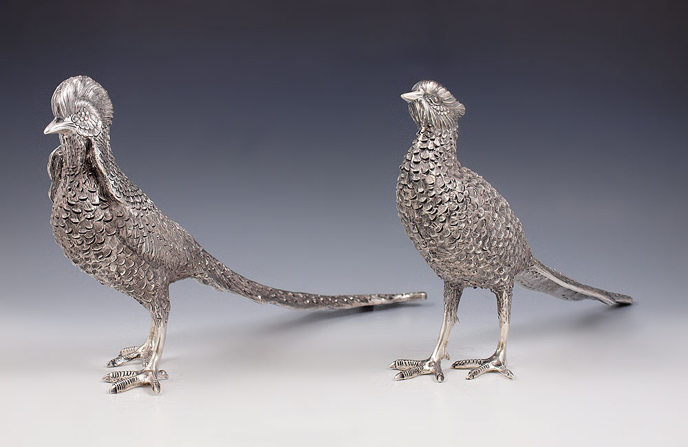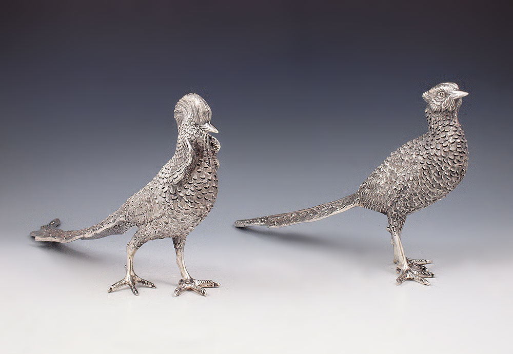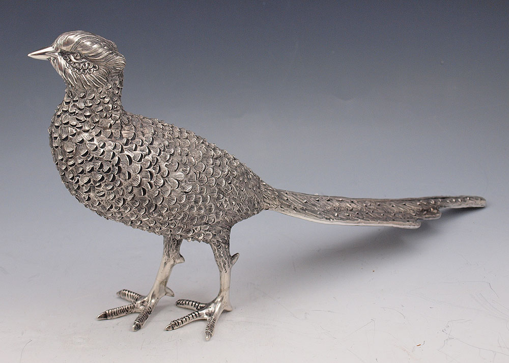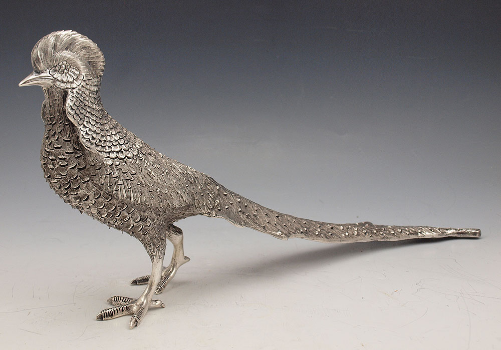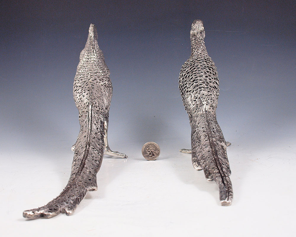 PAIR MEXICAN STERLING TABLE TOP PHEASANTS: Maker Fabian, stamped ''Sterling 925 Hecho en Mexico Fabian''. Hen and cock. Measure approx 14'' length, 7''h. 74.8 troy oz.