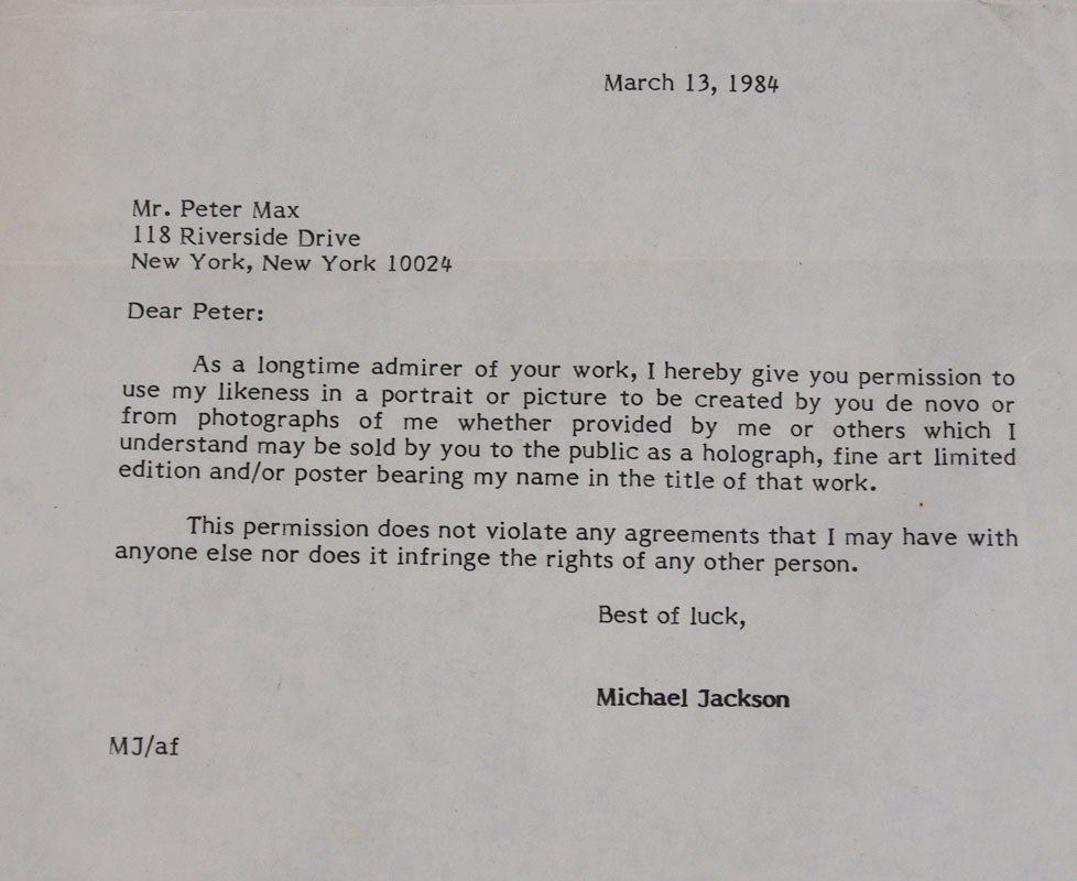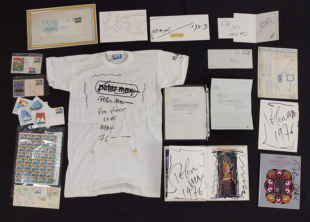 COLLECTION OF PETER MAX SIGNED MEMORABILIA: Collection is from Vincent Rottkamp, Peter Max's former agent's storage unit and includes a 1984 letter from Michael Jackson allowing Peter Max to use his likeness, unfortunately letter is unsigned. Signed tee shirt ''For Vince with Love Peter'', assorted doodles & sketches on notepad paper from the desk of Gladys Fleischmann Secretary Disco Factory Ltd., signed 1983 New Years card from Peter & Rosi, assorted signed pieces of paper, singed Sotheby's Catalog from 1989, signed sheet of stamps, signed first day cover envelopes, signed envelope with original watercolor art, signed Peter Max Paints America book with doodles, framed envelope with original sketch.