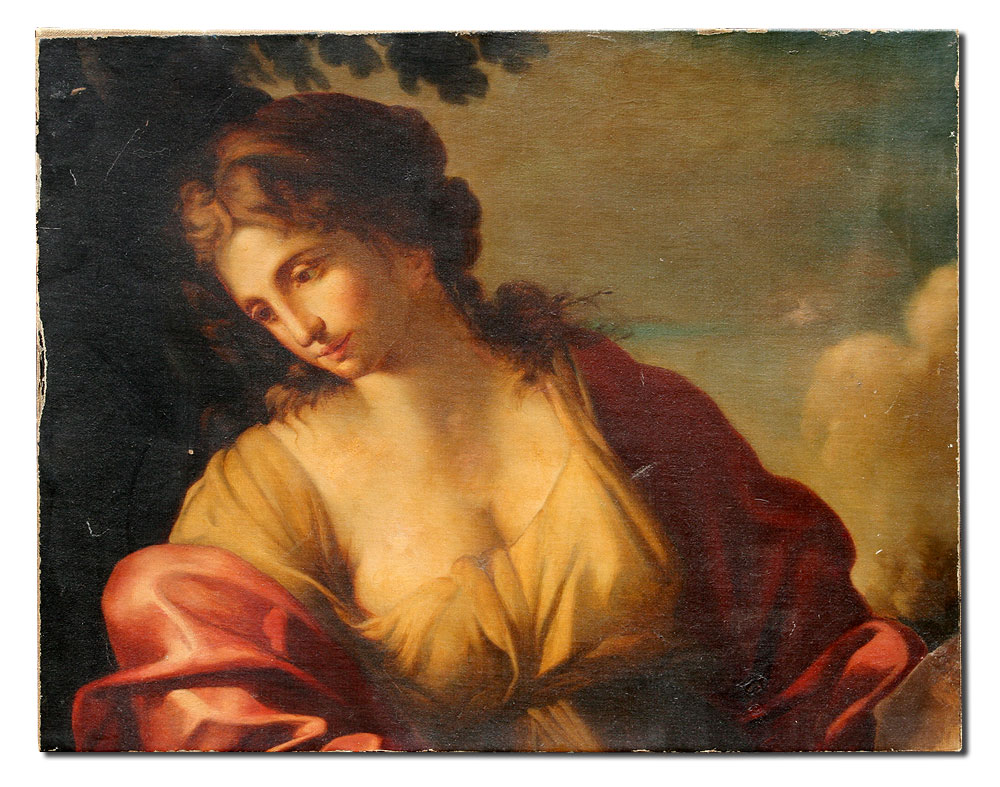 19TH C OR EARLIER ALLEGORICAL OIL/CANVAS OF MAIDEN: 22'' x 28'', no visible signature.