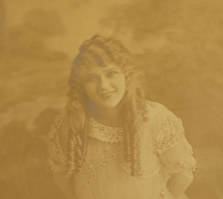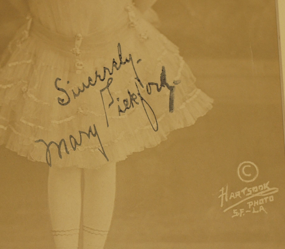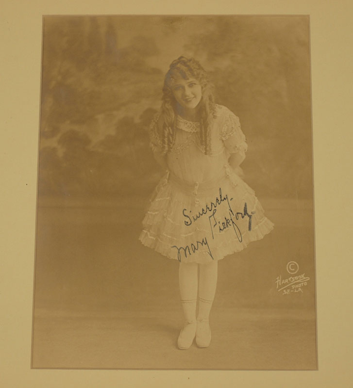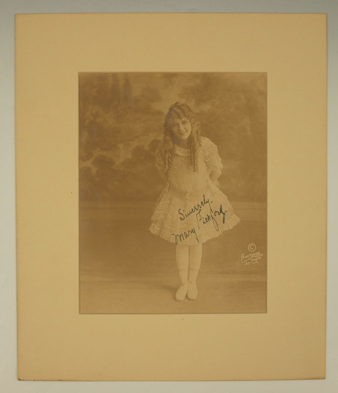 MARY PICKFORD SIGNED PHOTO: Unique image of Mary Pickford in baby doll dress, signed on the image. Image taken by Hartsook Photo Studio San Francisco / LA. Sight size 8 3/4'' x 6 3/4'', 13 1/2'' x 11 1/4''.