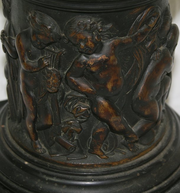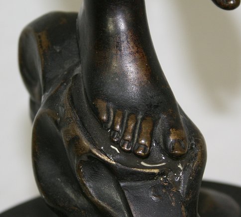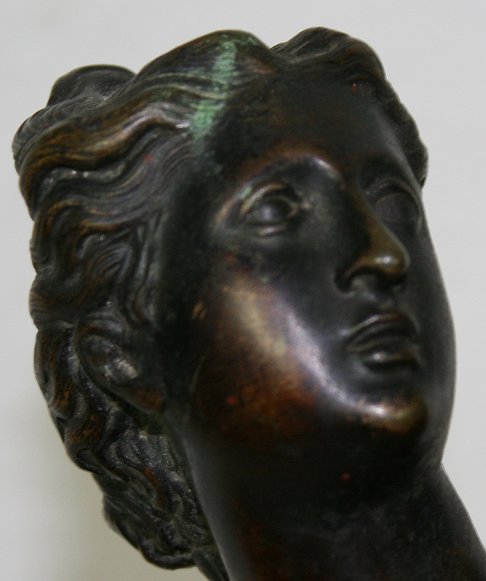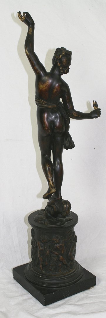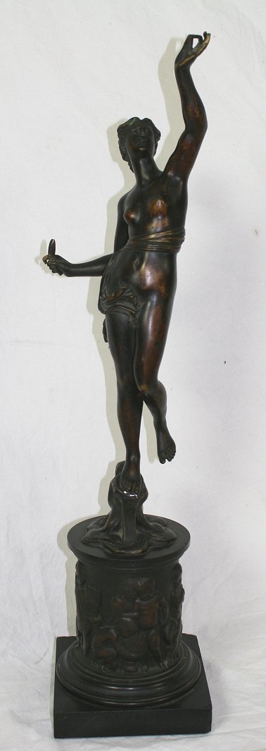 NEOCLASSICAL NUDE BRONZE: 19th C. figure depicts a female scantily clad reaching, affixed with epoxy to a relief bronze base, overall height of bronze is 27'', affixed to stone plinth, 29'' overall height including base, epoxy residue still visible.