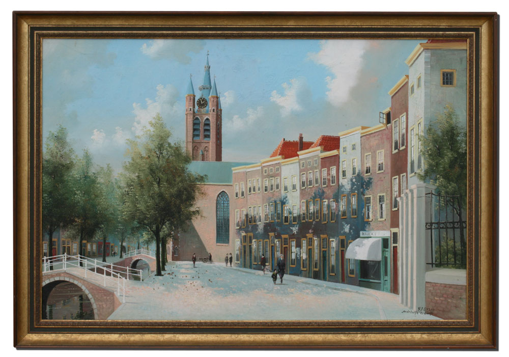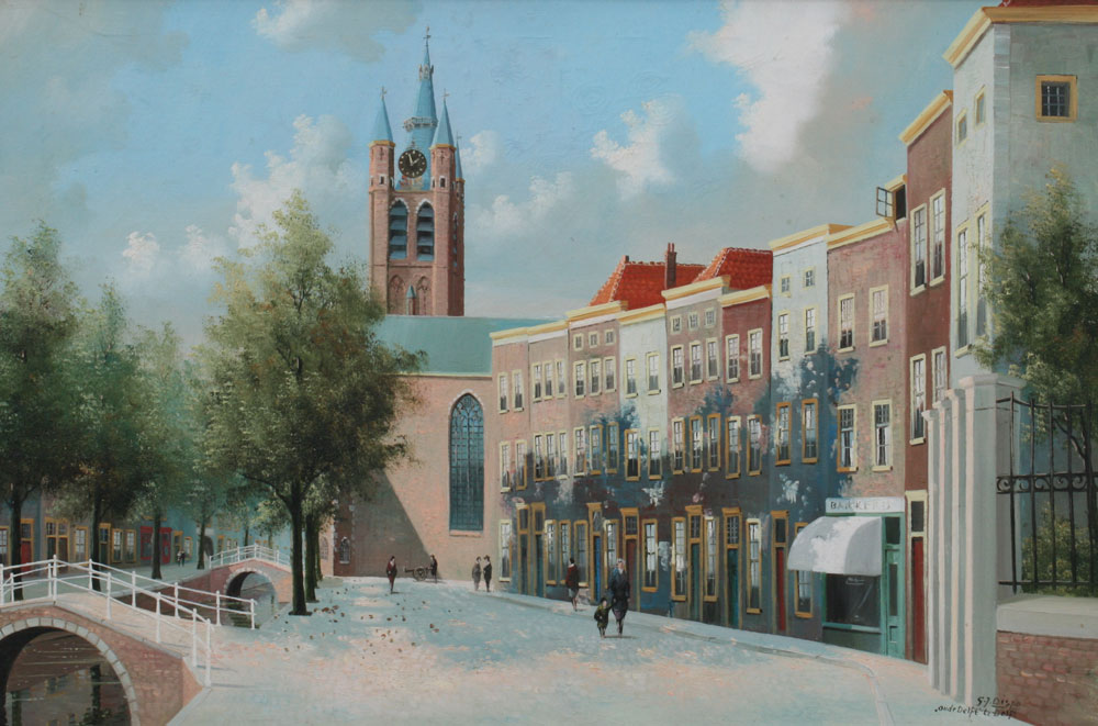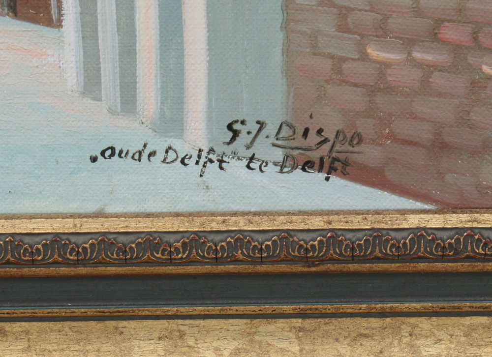 DISPO, George Jan, (Dutch, 1922-1973): ''Oude de Belft,'' Holland Street Scene with Figures Along the Waterfront, OIL/Canvas, 24'' x 36'', signed, framed 28'' x 41''.