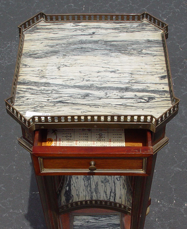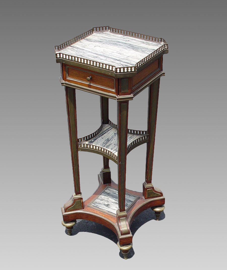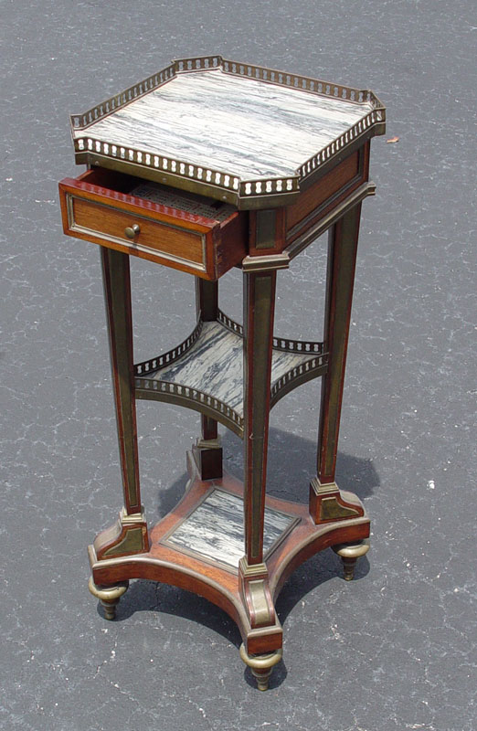EARLY 20TH C LOUIS VXI STYLE BRONZE MOUNTED STAND: Three tier marble top stand, single drawers, 32''H. X 12''.