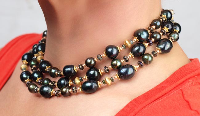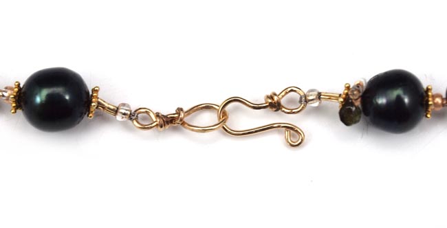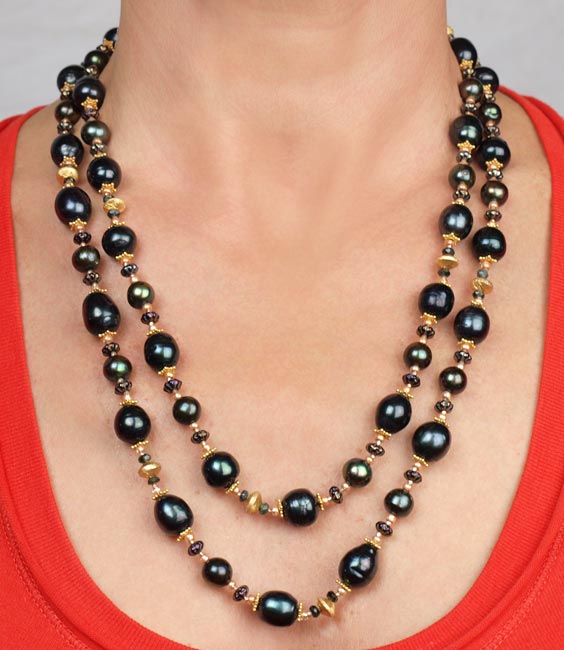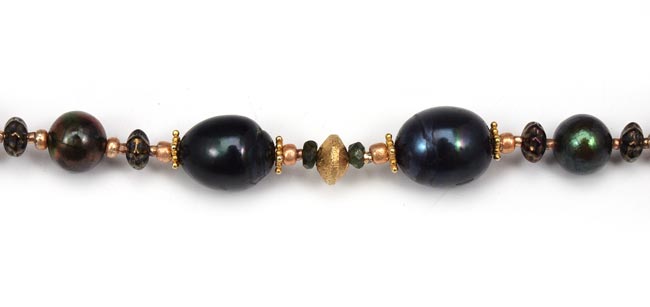47'' OPERA LENGTH PEARL AND TOURMALINE BEAD NECKLACE: A.Campos original. Made of large dark green potato pearls, antique Czech. flower beads, small green tourmaline beads, 14k gold filled beads in various sizes, 14k gold spacers & clasp.