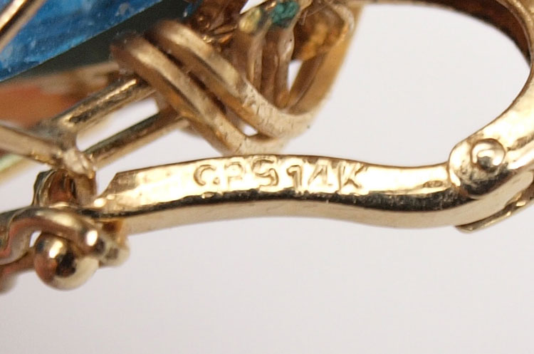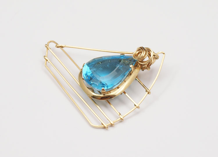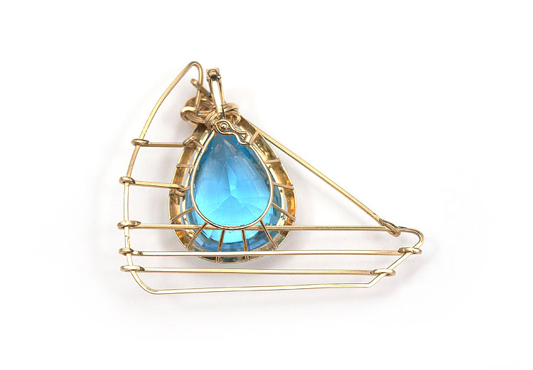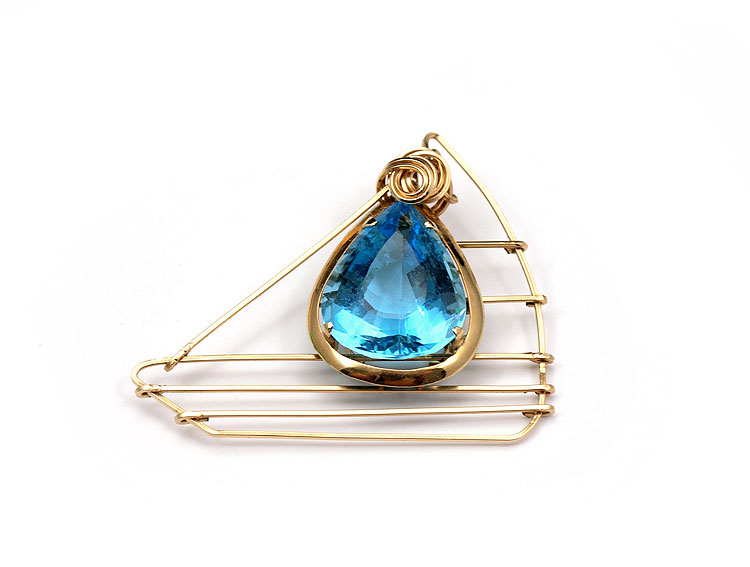 20 CT BLUE TOPAZ SAILBOAT PENDANT: One of a kind custom 14K yellow gold pendant contains one pear shaped blue topaz. Weight: 20.00 Ct. Approx. ''Swiss'' blue in color. A stylized sailboat of non-gold wire is constructed around the pendant Hinged bail with figure eight safety clasp. Gold weight: 5.0 grams. Approx.