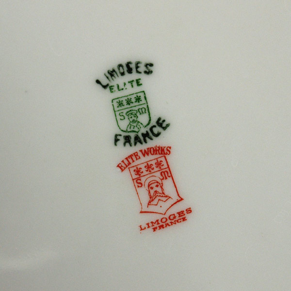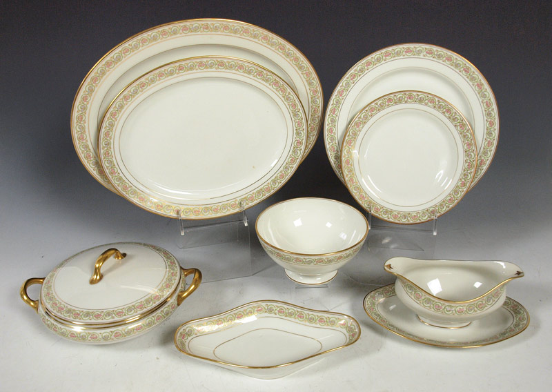 FRENCH LIMOGES FINE CHINA: Ca. Early 1900's Bawo & Dotter Elite Works. 41 pieces to include 12 dinner plates, 12 salad plates, 11 bouillon cups, relish dish, small vegetable bowl, covered vegetable, gravy and 2 platters, 12'' and 14''.