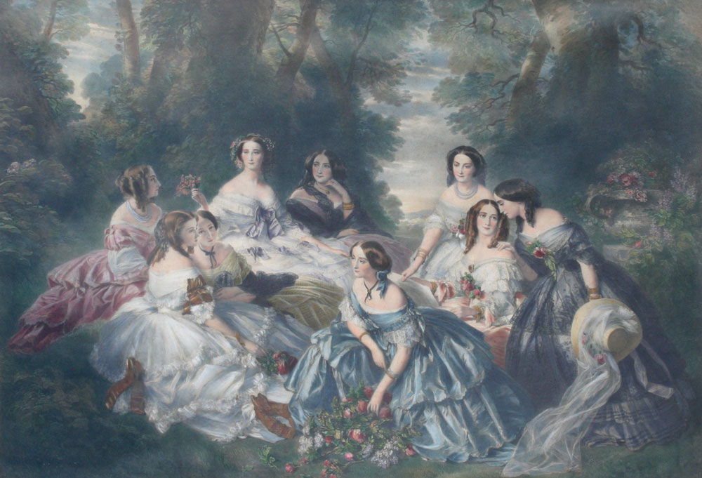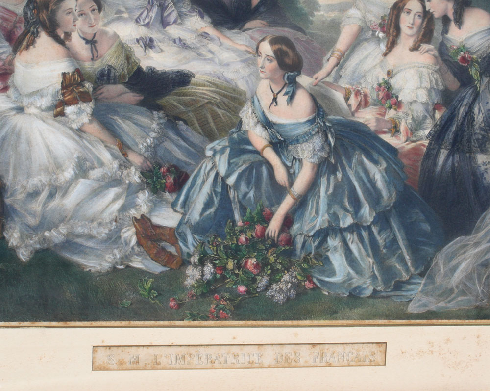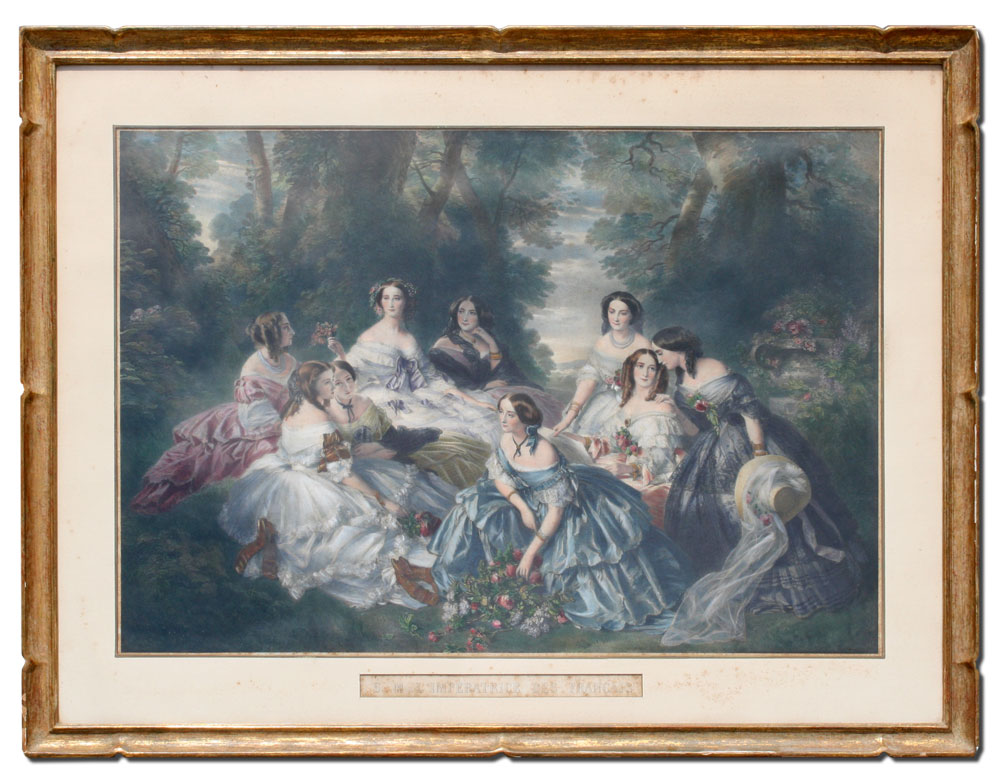 19th. C. HANDCOLORED ENGRAVING OF A GROUP OF WOMEN GATHERED IN A LANDSCAPE: S. M. L' Imperatrice des Francais, sight size 23 1/2'' x 33 1/2'', gilded frame with wear 32 1/2'' x 43 1/2''.